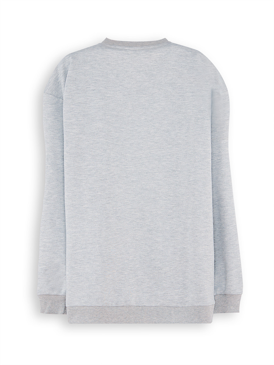 A gray melange sweatshirt designed for boys. Made of thick winter fabric. Long sleeves, crew neck. It features a dinosaur print on. All Denokids products are produced within "Kids Safety Guidelines" and have been passed through metal detect
