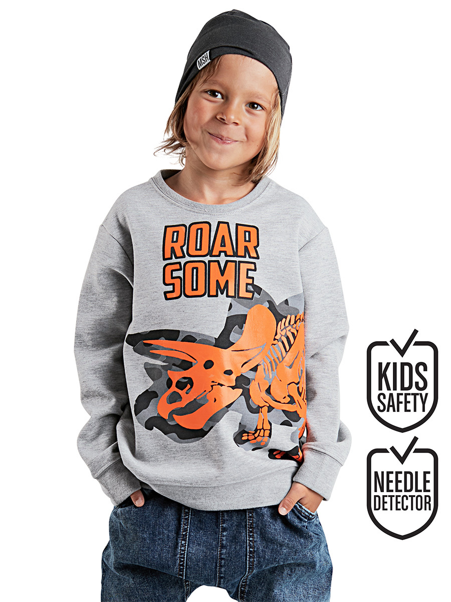 Erkek çocuk için tasarlanmış gri sweatshirt. Kalın kışlık kumaştan üretilmiştir. Uzun kollu, sıfır yakalıdır. Üzeri dinazor baskılıdır. Tüm Denokids ürünleri çocuk güvenliği düşünülerek üretilmiştir ve iğne dedektörlerinden geçirilmiştir. %68 Polyester %27 Pamuk %5 Elastan