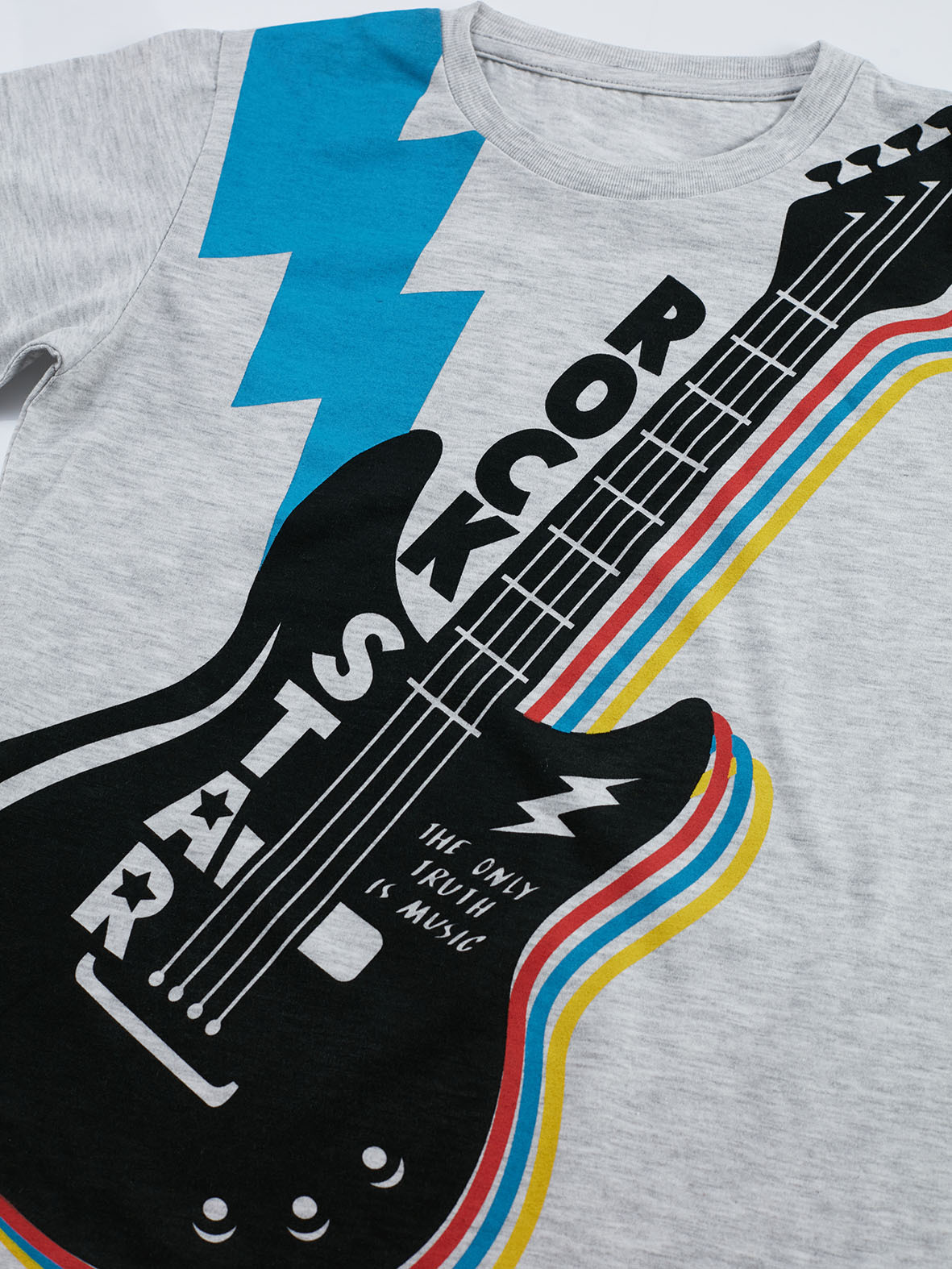 2'li takım. Pamuklu penye kumaştan üzeri gitar baskılı, uzun kollu t-shirt. Takımın tamamlayıcısı orta kalın pamuklu kumaştan, şimşek baskılı eşofman altı. Beli ve bilekleri lastiklidir. Üst: %65 pamuk %30 polyester %5 elastan Alt: %92 pamuk %8 elastan