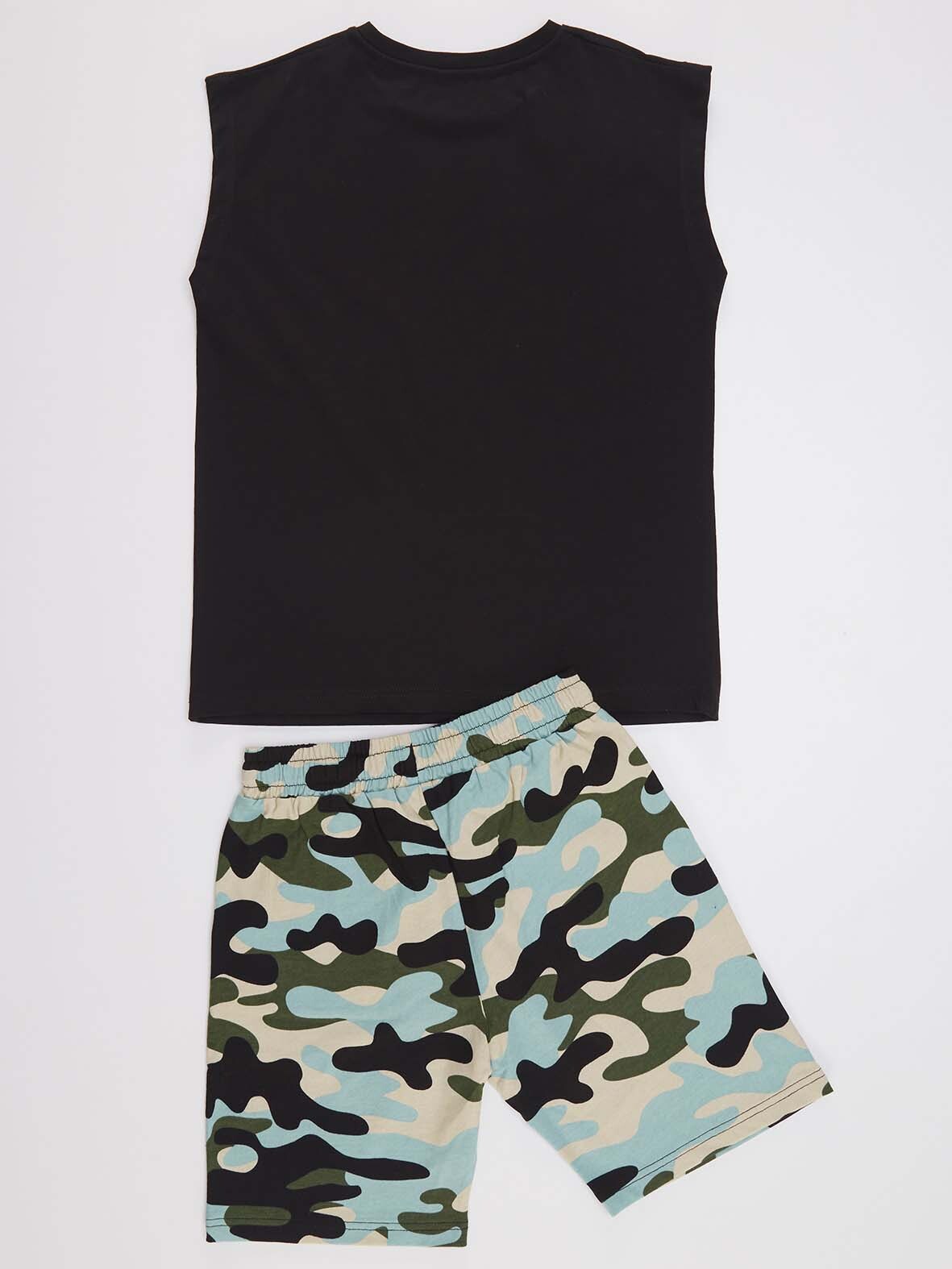 2 parça erkek çocuk t-shirt ve şort takım. Pamuklu penye kumaştan, üzeri dinozor baskılı, kısa kol t-shirt. Takımın tamamlayıcısı orta kalın pamuklu penye kumaştan, 2 yan cepli, kamuflaj desenli şort. Bu ürün Avrupa standartlarında "Çocuk Güvenliği Kuralları" gözetilerek üretilmiştir. İğne dedektörlerinden geçirilmiştir.