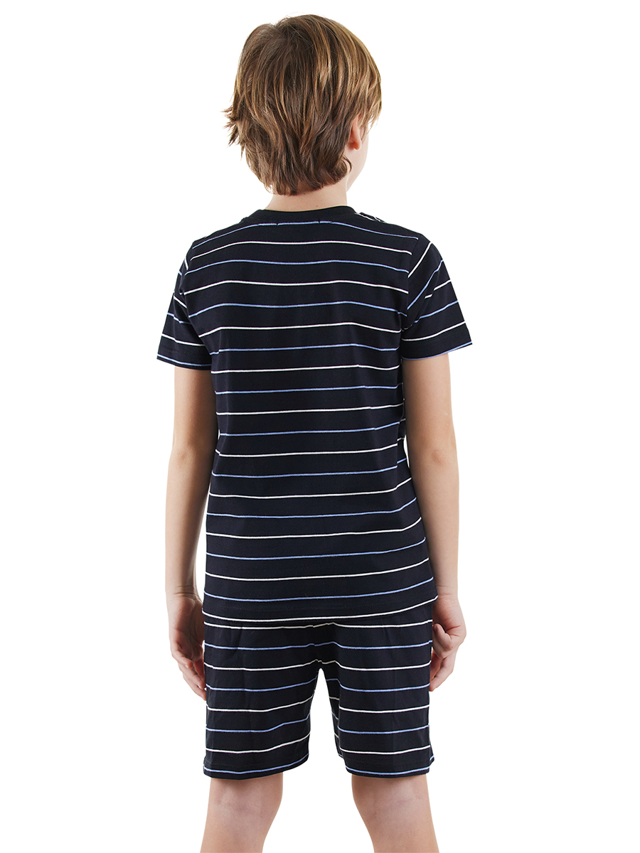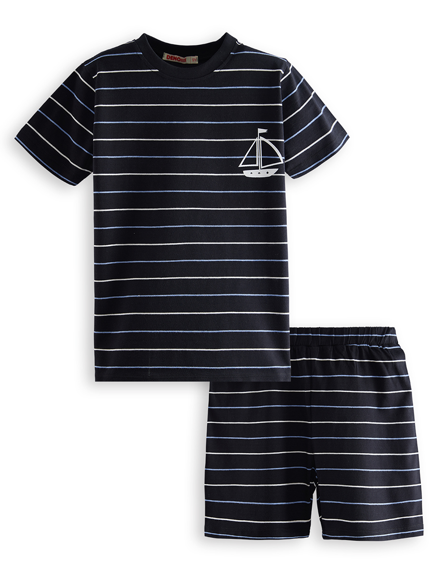 2 piece, boy striped, black pyjama set. 100% cotton jersey. Short sleeve, crew neck. Sail boat print. The bottom of the set is designed as comfortable shorts. All Denokids products are produced in accordance with European standards and "Chi