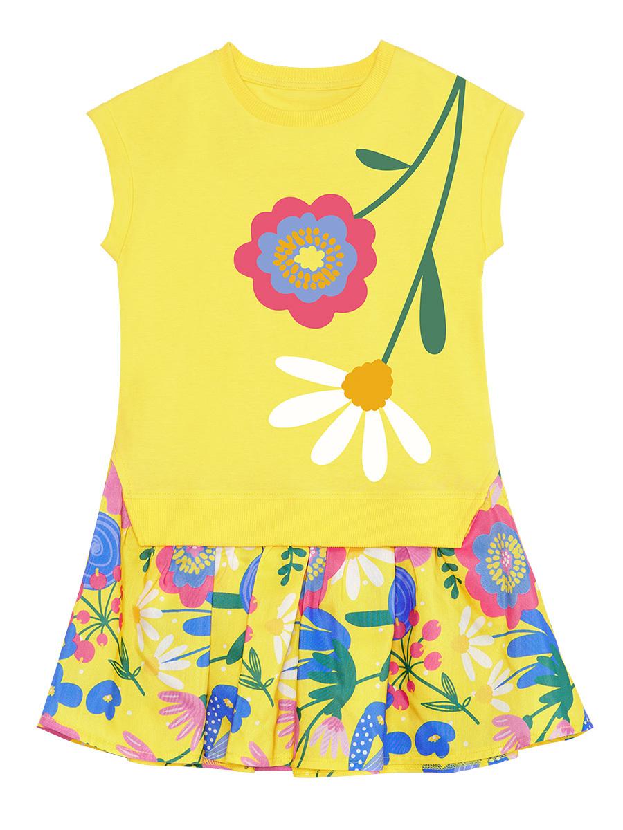 Pamuklu penye kumaştan, sarı kız çocuk elbise. Üzeri çiçek baskılıdır. Etekleri çiçek desenli dokuma kumaştan, fırfırlı olarak dikilmiştir. Tüm MSHB&G ürünleri çocuk güvenlik kurallarına uygun olarak üretilmekte ve iğne dedektörlerinden geçmektedir.