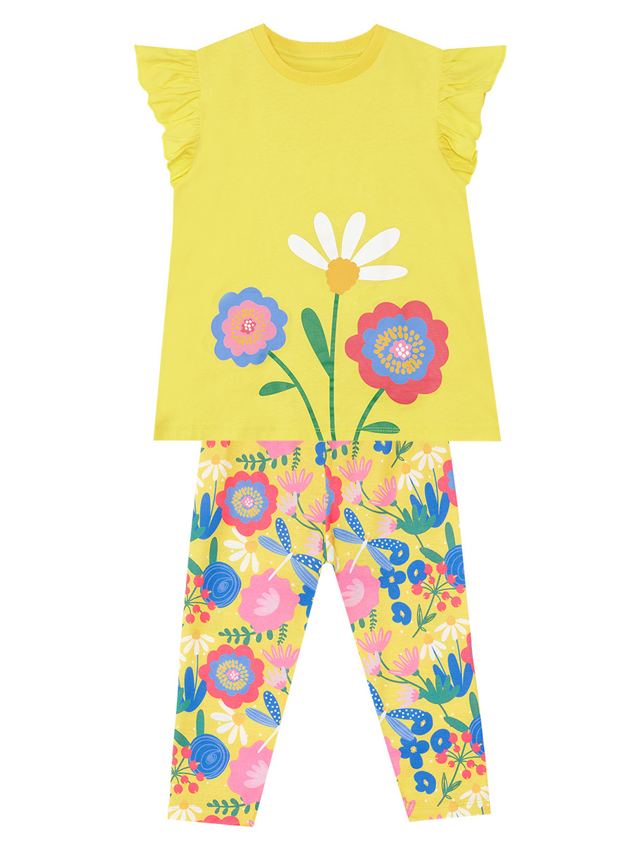 2 parça kız çocuk takım. Pamuklu penye kumaştan, sarı t-shirt. Üzeri çiçek baskılı. Takımın tamamlayıcısı, çiçek desenli, elastik tayt. Tüm MSHB&G ürünleri çocuk güvenlik kurallarına uygun üretilmektedir. Üst: %100 Pamuk - Alt: %100 Polyester