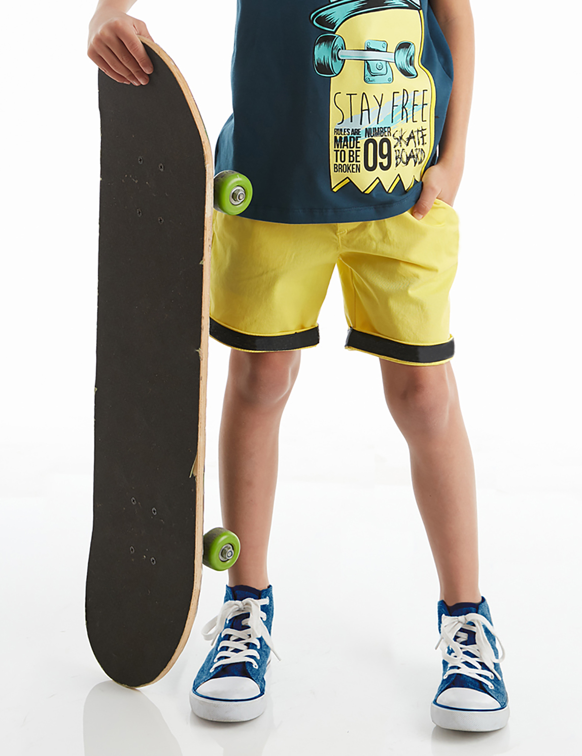 Erkek çocuk gabardin kumaştan, geriye doğru katlanabilen şort. %97 pamuk %3 elastan