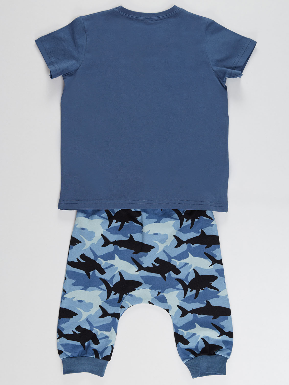2 parça erkek çocuk kamuflaj kapri ve t-shirt takım. Köpekbalığı baskılı t-shirt ve köpekbalıklarından kamuflaj desenli, düşük ağ kesimli kapri. Alt: %100 pamuk, Üst: :%92 pamuk %8 Elastan
