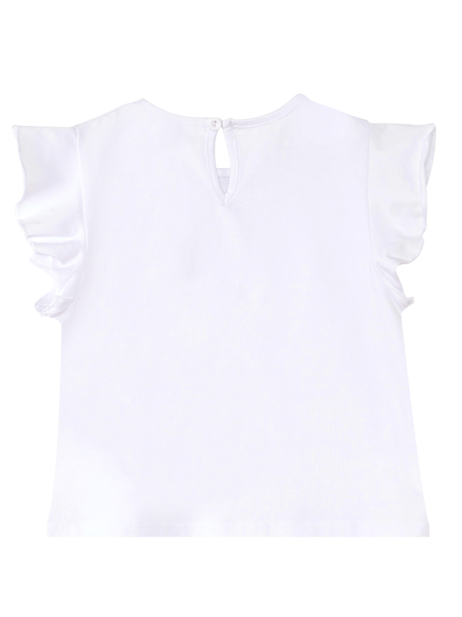 2 piece set. Cotton jersey white t-shirt. Frills on shoulders. Has a cute, shiny unicorn print on. Shorts is made of 100% cotton, poplin fabric. Has 2 side pockets. Elasticated waistband and strings on. All Denokids Products are manufacture