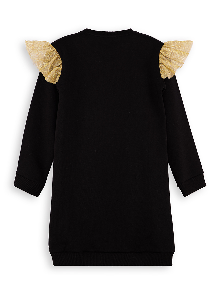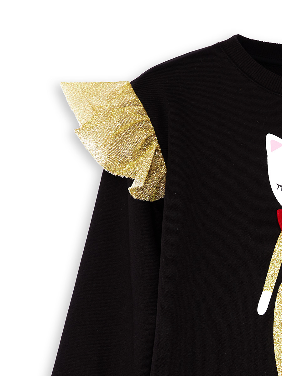 Kalın, %100 pamuklu kumaştan kız çocuk siyah elbise. Uzun kollu, sıfır yaka, dizüstü boy. Omuzlarda simli kumaştan fırfır detayı vardır. Altın rengi sim ile kedi deseni baskılıdır. Tüm Denokids ürünleri çocuk güvenliği düşünülerek üretilmiştir ve iğne dedektörlerinden geçirilmiştir. %100 Pamuk