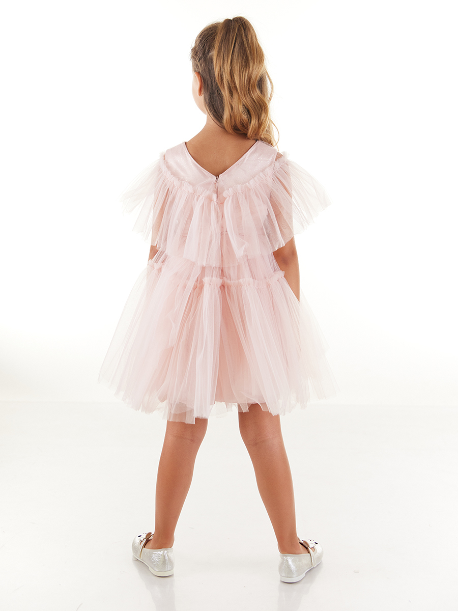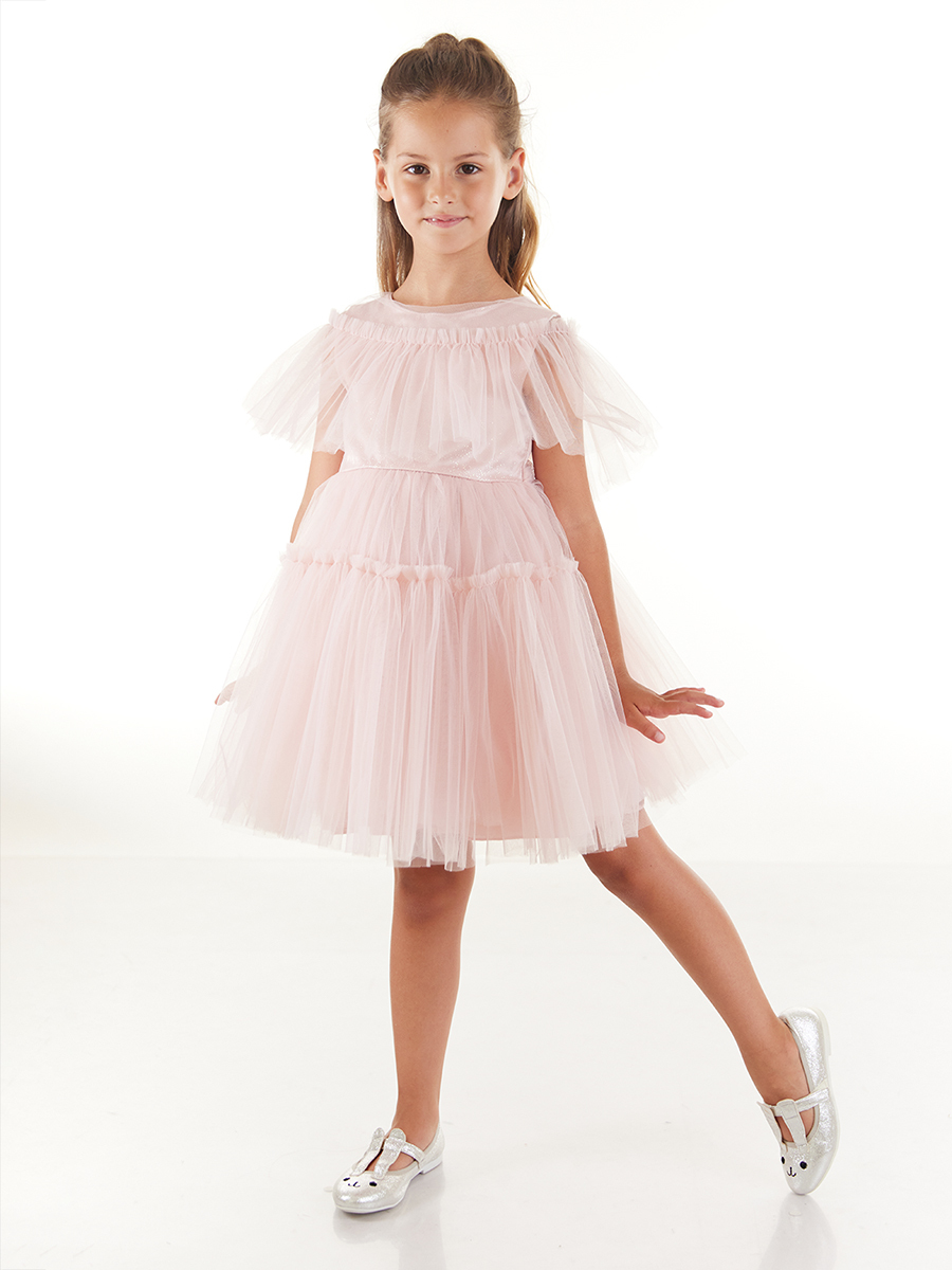 Bisiklet yakalı ve kolsuz abiye elbise. Yaka detayına dikilen üst tül, kola ve üst gövdeye farklı bir görünüm katmıştır. Tülün altındaki üst gövde simli kumaş görünümlüdür. Eteği kabarık tüllüdür. Arkasındaki gizli fermuarı sayesinde kolayca giyilip çıkarılabilir. Arka belinde fiyonk detayı bulunmaktadır. Astarlıdır. Bu elbise, kızınızın düğünlerde vazgeçilmezi olacak.