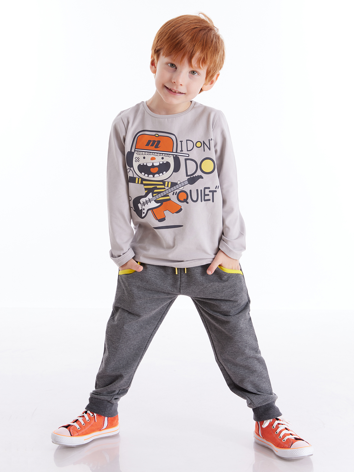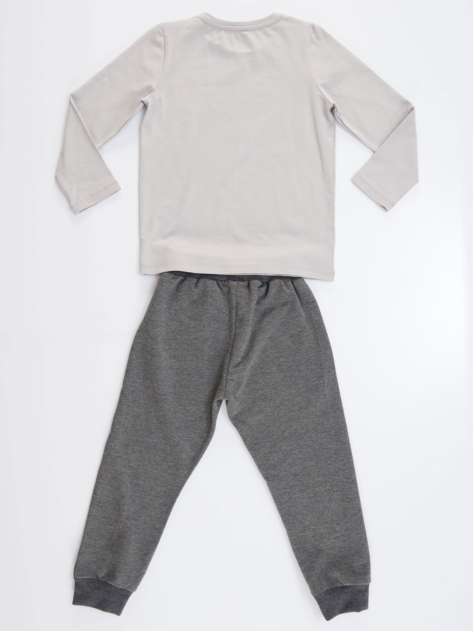 2 piece set. Printed, long sleeve, cotton jersey t-shirt and cotton pants with side pockets and waist strings. Top: %65 Cotton %30 Polyester %5 Elastane Bottom:%65 Cotton %30 Polyester %5 Elastane