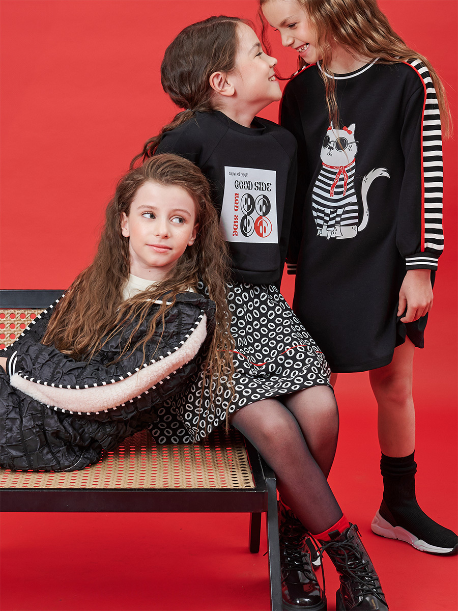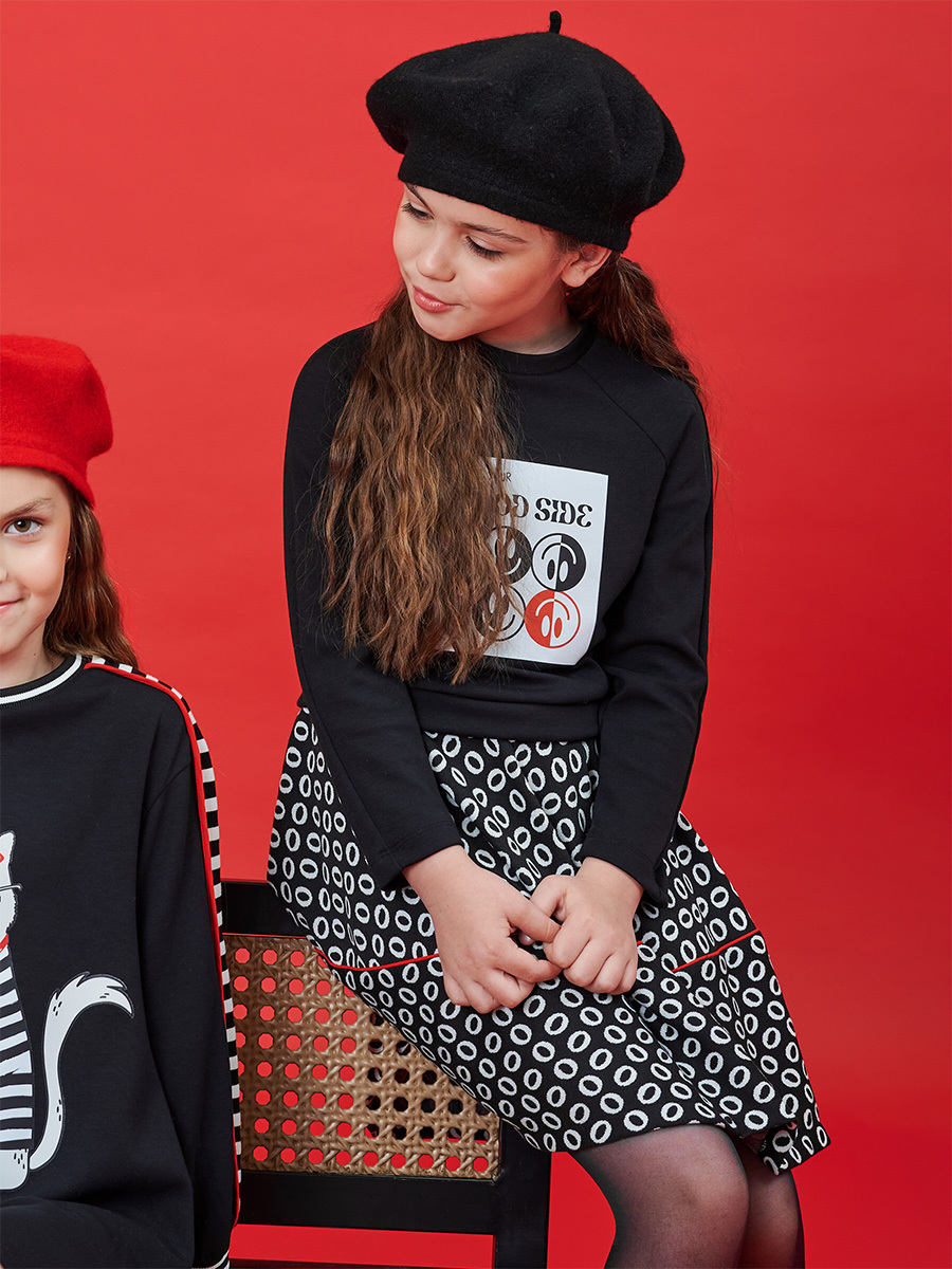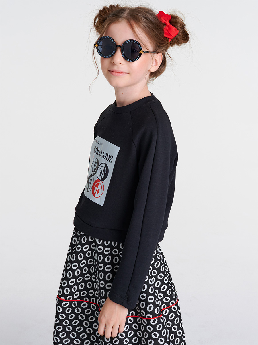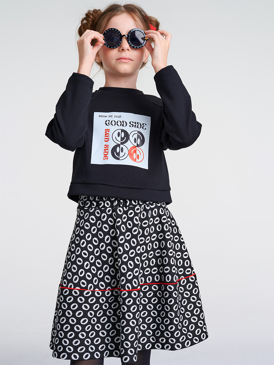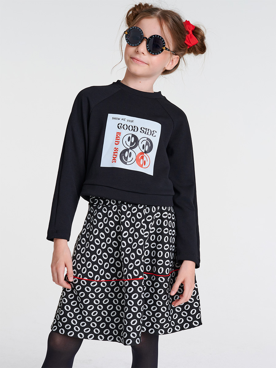 Siyah Örme Kumaş Sweatshırt Tarzında Rahat Kalıp Kız Çocuk Blüz, Siyah Beyaz Minik Desenli İki Katlı Etek İle Takımdır. Etek Astarsızdır. %80 Polyester %16 Viskon %4 Elastan İkincil Kumaş %96,5Viskon %3,5 Elastan