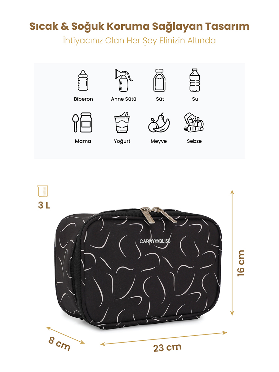 Detaylar Boyutlar – 23 cm G × 16 cm Y × 8 cm D Kapama – Fermuarlı kapama, yiyecek ve atıştırmalıkların güvenli şekilde taşınmasını sağlar Kumaş – Antibakteriyel astar, hijyen seviyesini artırır Isı Yalıtımı – Termal iç yüzey, mamanın ve atıştırmalıkların ideal sıcaklıkta kalmasına yardımcı olur Ekstralar – Hafif yapısı günlük taşıma ve seyahatler için idealdir Test – Uluslararası ASTM antibakteriyel testi onaylıdır; 24 saatte %99 bakteri azalımı Özellikler • Isı yalıtımlı iç yüzey, yiyecekleri uzun süre ideal sıcaklıkta tutar • Antibakteriyel astar, hijyenik kullanım sağlar • Hafif ve kompakt tasarım çantaya kolayca sığar • Fermuarlı kapama, güvenli ve düzenli taşıma imkânı sunar • Günlük kullanım, park gezileri ve seyahatler için idealdir Ürün Hikayesi ThermaPouch, ebeveynlerin dışarıda geçirdiği zamanlarda mama ve atıştırmalıkları güvenle taşıyabilmesi için Carry Bliss’in geliştirdiği özel bir çözüm olarak ortaya çıktı. Bebeklerin beslenme düzeninde sıcaklığın ve hijyenin ne kadar önemli olduğunu bilen marka, bu ihtiyaçtan ilham alarak hem işlevsel hem de kompakt bir tasarım oluşturdu. ThermaPouch’un termal yapısı, mamanın ve sağlıklı atıştırmalıkların saatlerce ideal sıcaklıkta kalmasını sağlar. Antibakteriyel astarlı iç yüzey ise yiyecekler için her zaman temiz ve güvenli bir alan sunar. Hafifliği ve kompakt ölçüleri sayesinde ister büyük bir çantanın içine kolayca yerleştirilir, ister tek başına kolaylıkla taşınır. Yoğun şehir yaşamında, parka giderken veya kısa bir yolculuk sırasında ebeveynlere pratiklik kazandırmak için tasarlanan ThermaPouch, beslenme eşyalarını düzenli, temiz ve doğru sıcaklıkta tutarak çocukların ihtiyaçlarına anında yanıt verir. %100 polyester