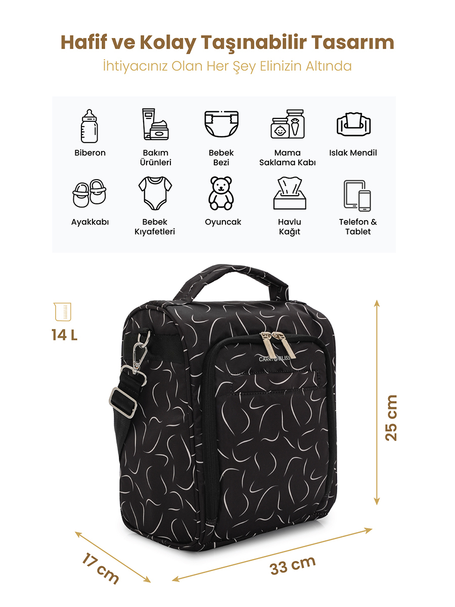 Siyah Dalgalı Çok Fonksiyonlu Çapraz Anne Çantası