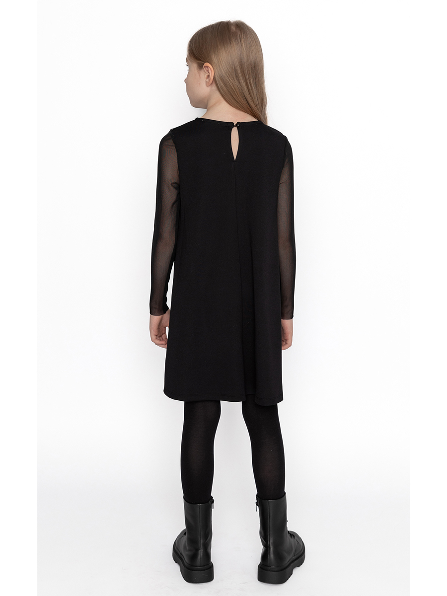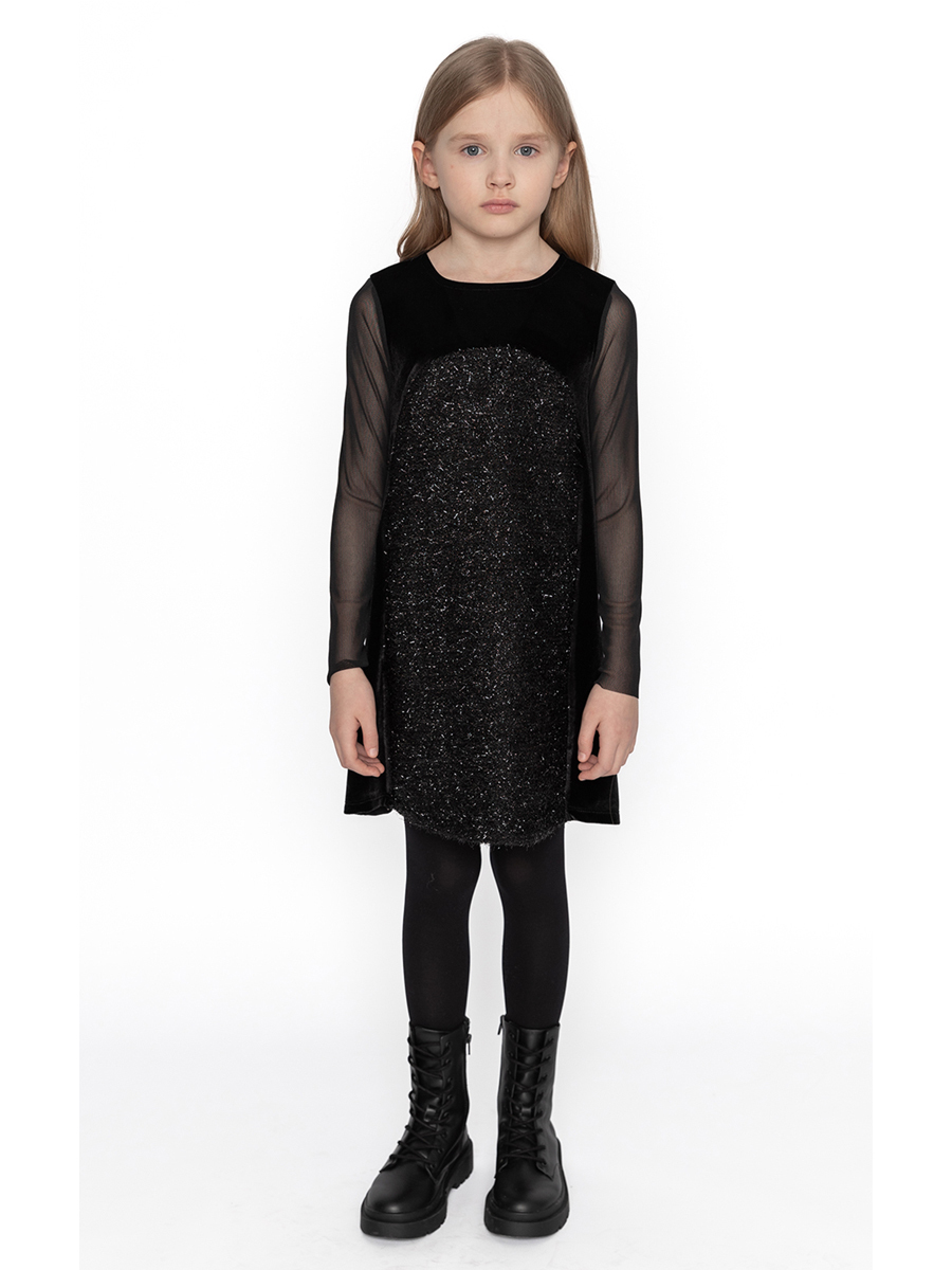 Kolları şeffaf tülden, göğüs kısmı simli püsküllü kumaştan üretimiştir. Elbisenin arka kısmı kadifedir. %55 Polyester %40 Metalik %5Liyosel İkincil Kumaş %67 Viskon %26 Polyester %7 Elastan Astar %100 Pamuk