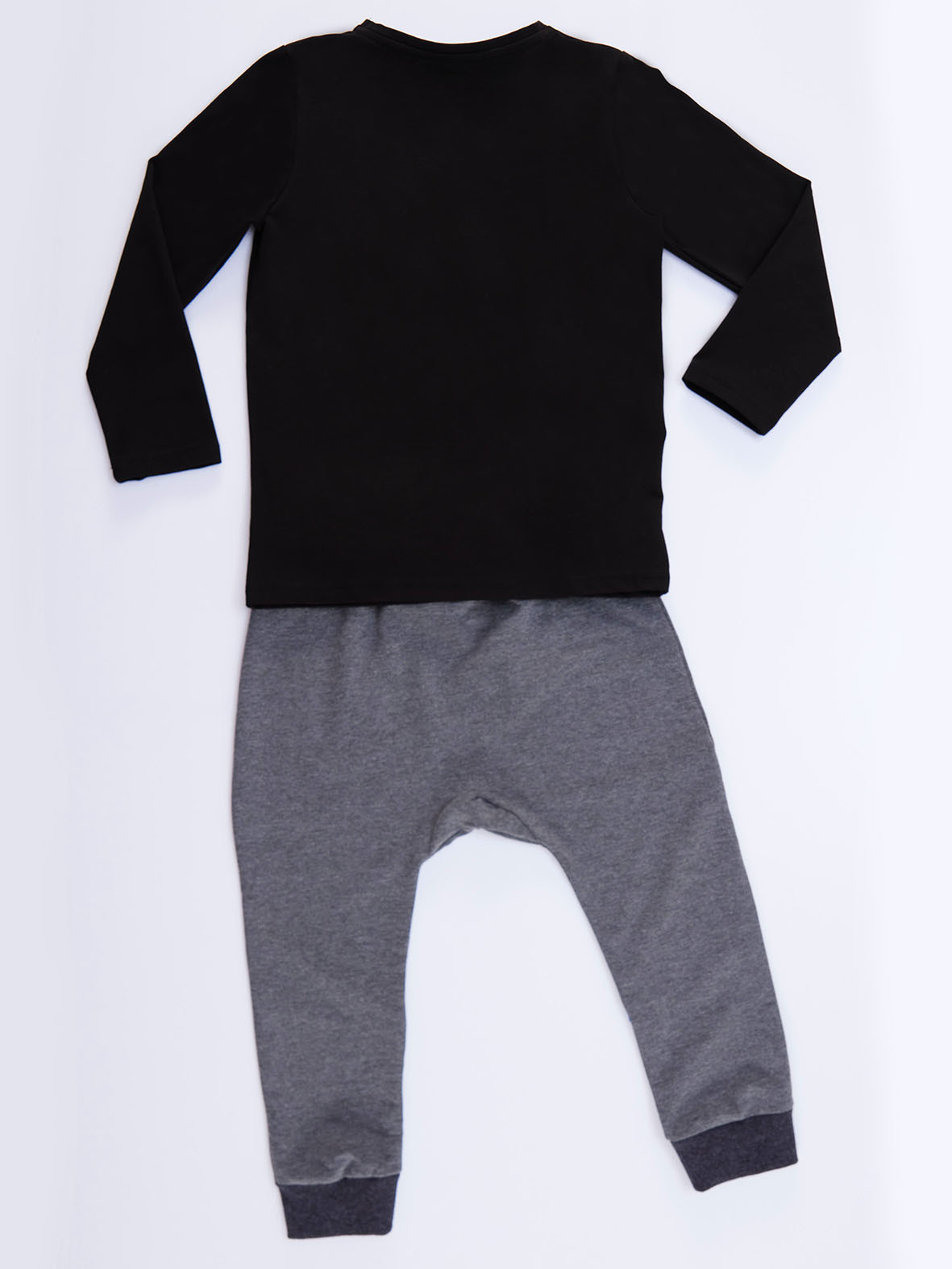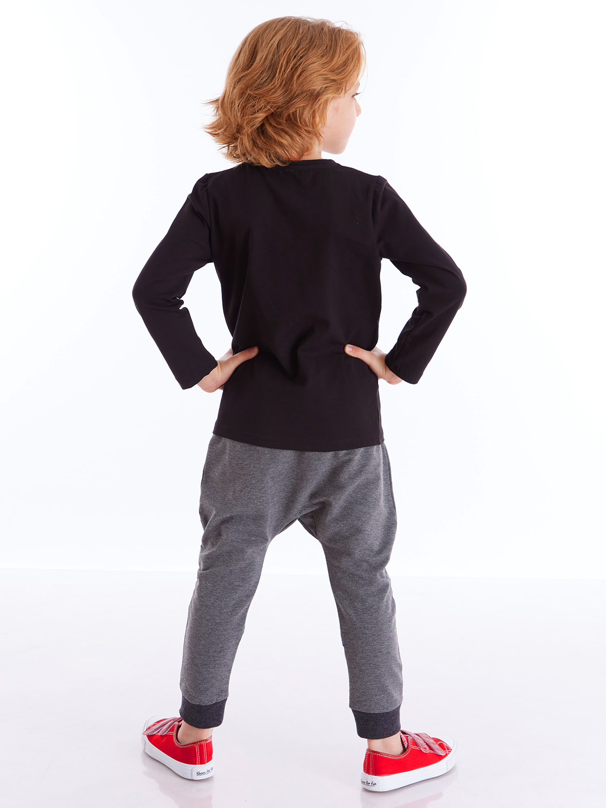 2 piece set. Printed, long sleeve, cotton jersey t-shirt and baggy style pants with waist strings. Top: %92 cotton %8 elestane Bottom: % 65 cotton 30 polyester 5 elestane