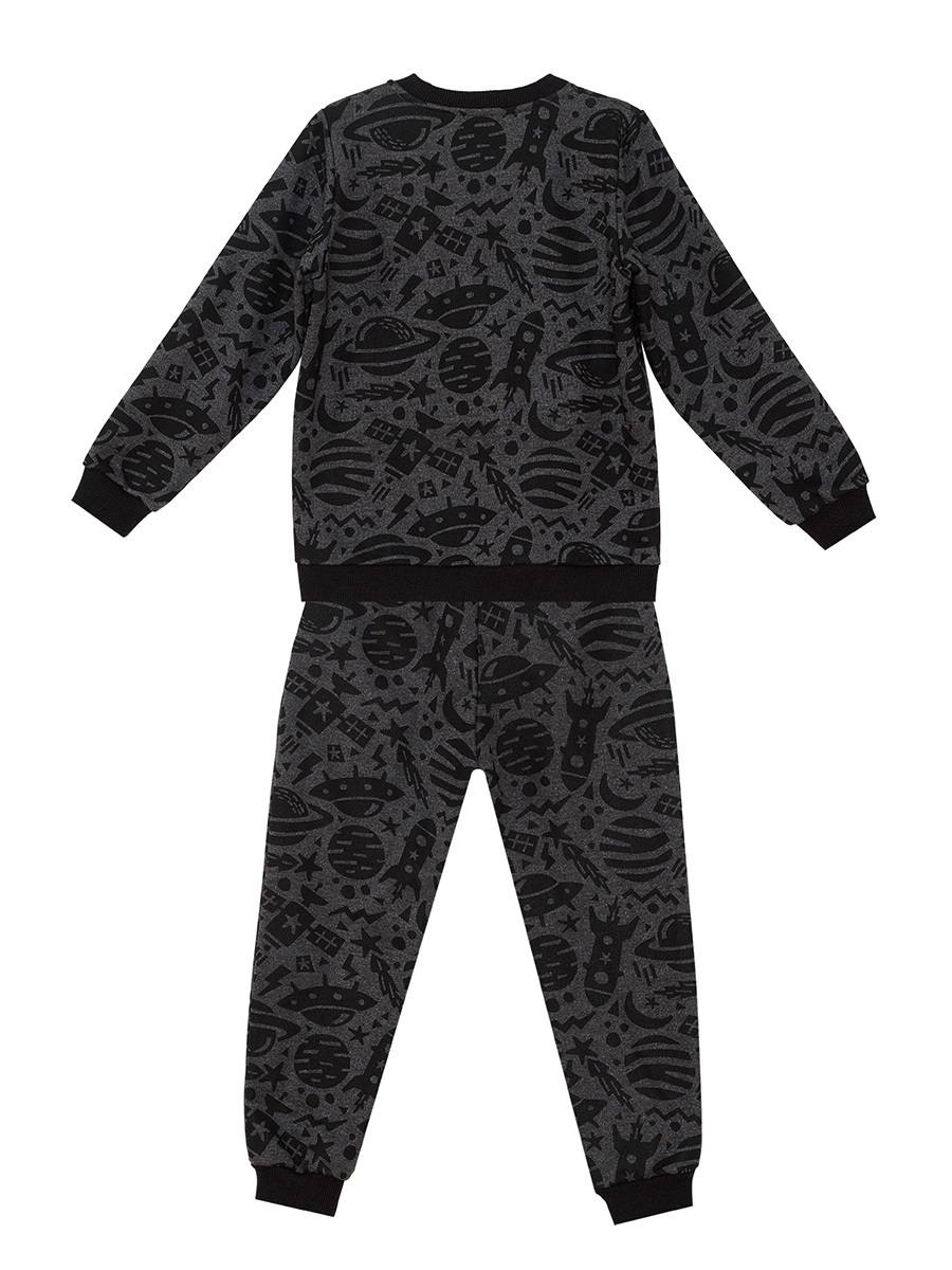 2 piece boy tracksuit. This cosy sweatshirt and jogger set is made in anthracite, thick sweat fabric. Features long sleeve, crew neck sweater and matching cuffed joggers. Has all-over space print. Elasticated waistband. Has 2 side pockets.