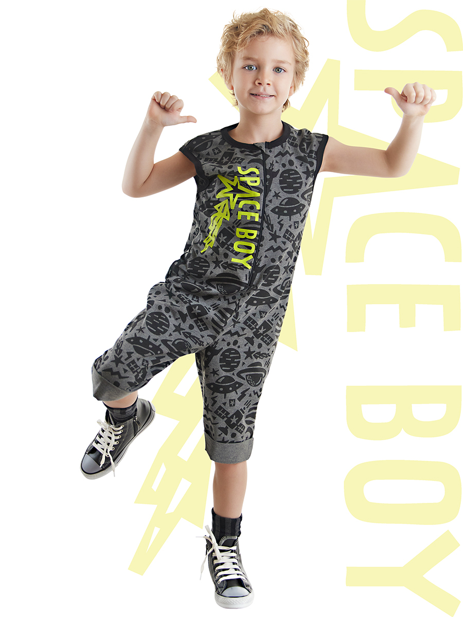 Allover space pattern printed boy overall. Has a harem style cut. Easy to wear on&off due to its zipper. All Denokids products are produced within Kids Safety Guidelines. To avoid any needles or metal debris, all products are inspected by m