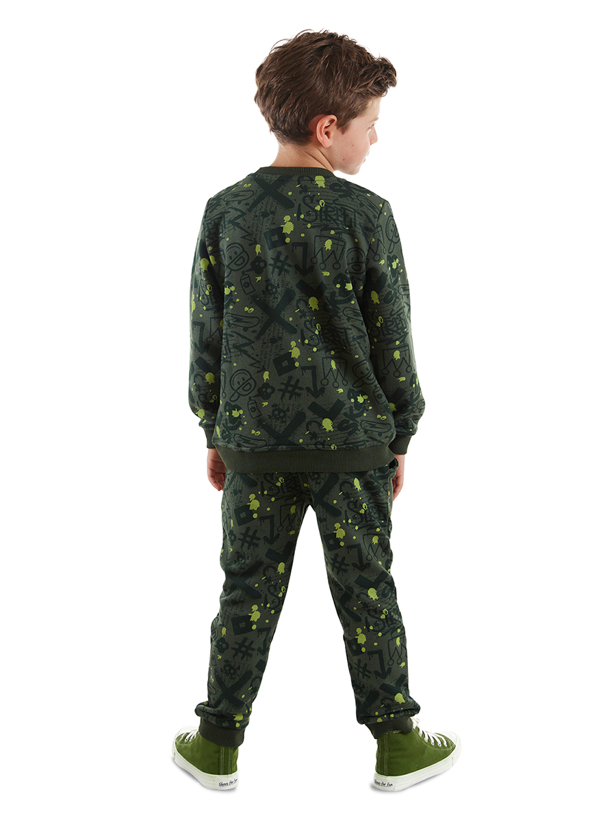 2 parça erkek çocuk eşofman takım. Kalın kışlık, pamuklu kumaştan üretilmiştir. Alt ve üst grafiti desen metraj baskılıdır. 2 yan ceplidir. Beli hem lastik hem de kordon detaylıdır. Tüm MSHB&G ürünleri çocuk güvenliği düşünülerek üretilmiştir ve iğne dedektörlerinden geçirilmiştir. Üst, Alt: %66 Pamuk %34 Polyester
