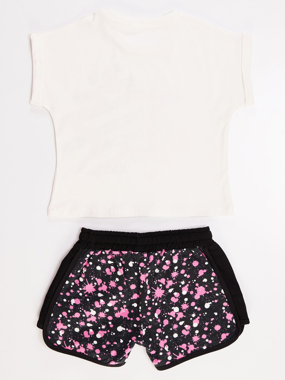 2 parça takım. Crop-top, kısa kesim, üzeri baskılı, pamuklu kumaştan t-shirt ve pamuklu kumaştan özel kesim, mini şort. Üst: %100 Pamuk - Alt: %95 Pamuk %5 Elastan