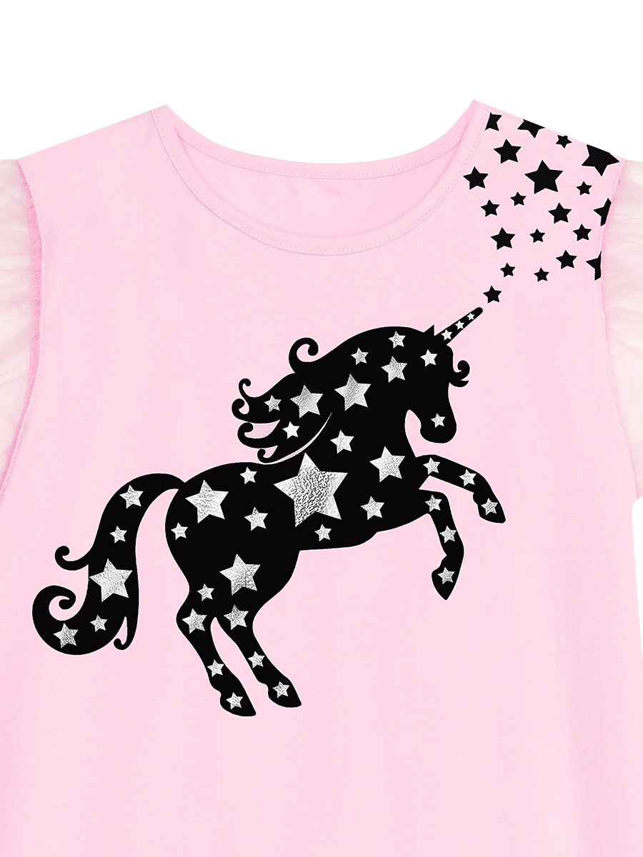 Cotton jersey girl, pink dress. The arms are made of tulle fabric. 2 layered frills on skirt, top is tulle. A unicorn print with foil stars on. All MSHB&G products are produced within Kids Safety Guidelines. To avoid any needles or metal de