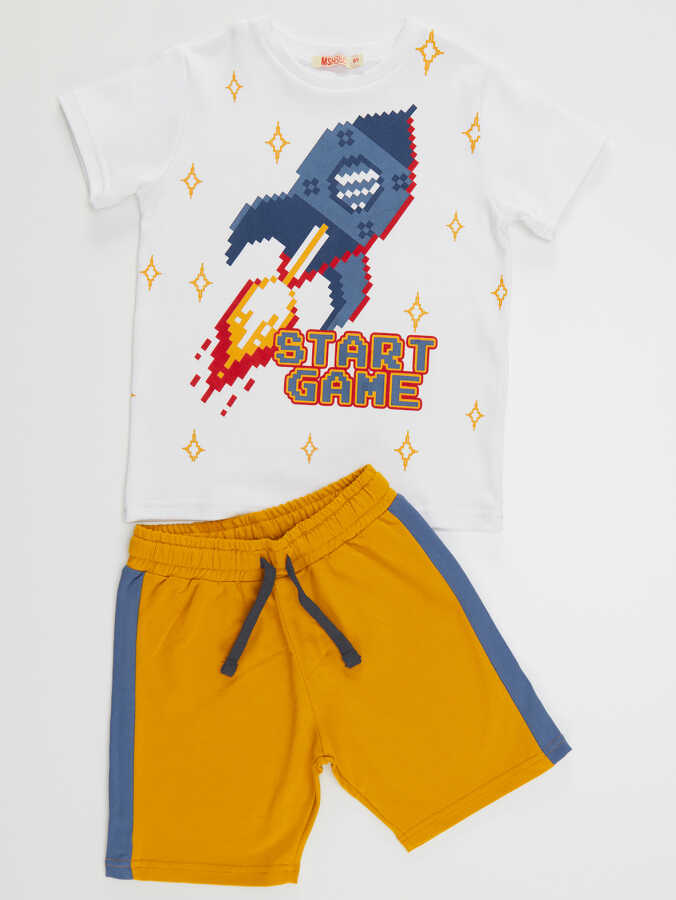 2 piece, t-shirt&shorts set. T-shirt is made of cotton jersey and has a rocket print on. The shorts is made of mid-thick cotton jersey with side strites on. Elastic waist and strings on. Top,Bottom; 100% cotton