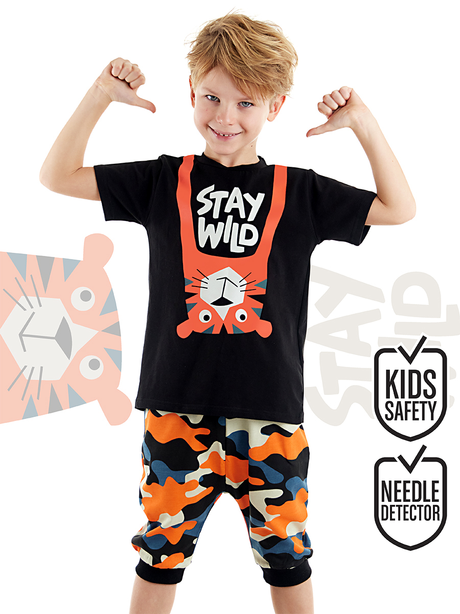 2 parça erkek çocuk t-shirt ve kapri pantolon takım. Pamuklu penye kumaştan üzeri kaplan baskılı t-shirt. Ve takımın tamamlayıcısı düşük ağ kesimli, kamuflaj desenli pamuklu penye kumaştan kapri boy pantolon. Tüm Denokids ürünleri çocuk güvenlik kurallarına uygun üretilmekte ve tek tek iğne dedektörlerinden geçmektedir. Üst,Alt: %100 Pamuk