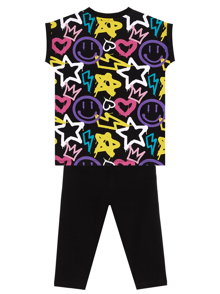 2 piece girl set. Cotton jersey, black t-shirt. A sprey grafitti print on. Cotton jersey, elastic, black leggings. Has a heart&star print on. All MSHB&G products are manufactured within the Kids Safety Guideline. Has been inspected by metal