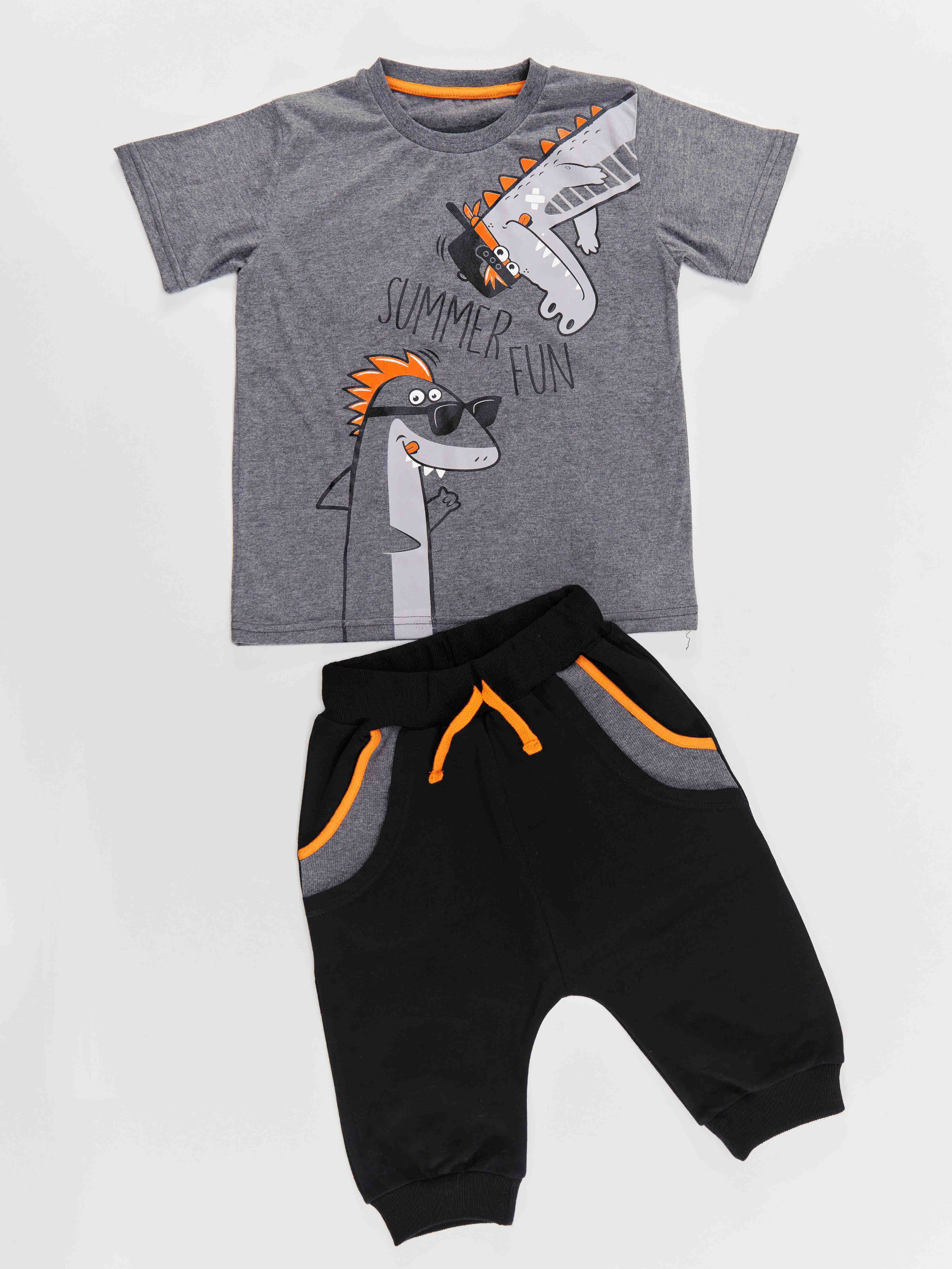 2 piece boy set. Cotton jersey t-shirt with dinos print on. The set is completed with its cotton harem style capri pants. Has has 2 front pockets. All Denokids Products are manufactured within the Kids Safety Guideline. Has been inspected b
