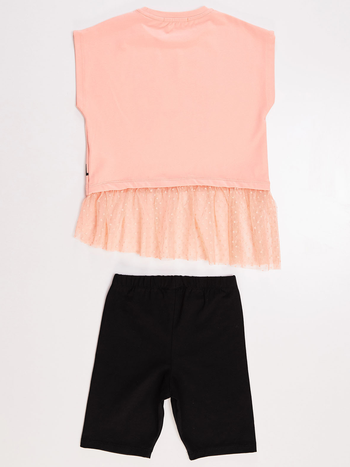 2 parça takım. Loepar baskılı, pamuklu kumaştan crop-top tunik. Tuniğin belden aşağısı puantiyeli tül ile dikilmiştir. Takımın tamamlayıcısı tayt elastik, pamuklu kumaştan üretilmiştir. %92 pamuk %8 elastan