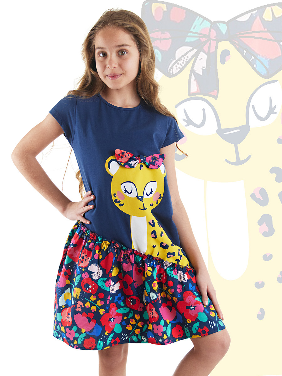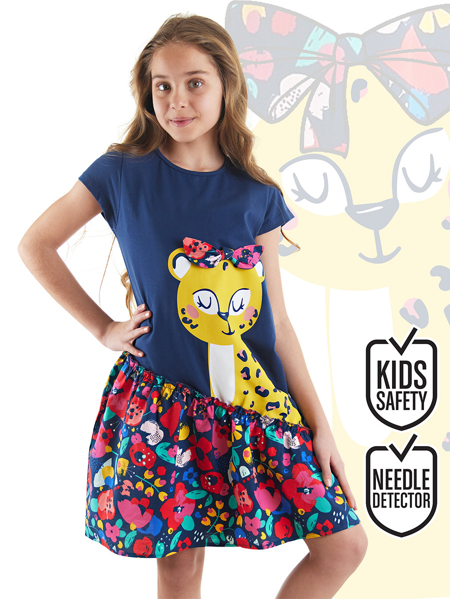 Pamuklu penye kumaştan kız çocuk, lacivert elbise. Üzeri zarif leopar baskılıdır. Leoparın başında 3 boyutlu kurdele vardır. Elbisenin etek fırfırları poplin kumaştan yapılmıştır. Tüm MSHB&G ürünleri Çocuk Güvenlik Kuralları'na uygun olarak üretilmektedir. Çocuğunuzun tenine bir zarar gelmemesi için tüm ürünler, iğne kırıklarını tespit edebilen metal dedektörlerinden geçirilmektedir. %95 Pamuk %5 Elastan