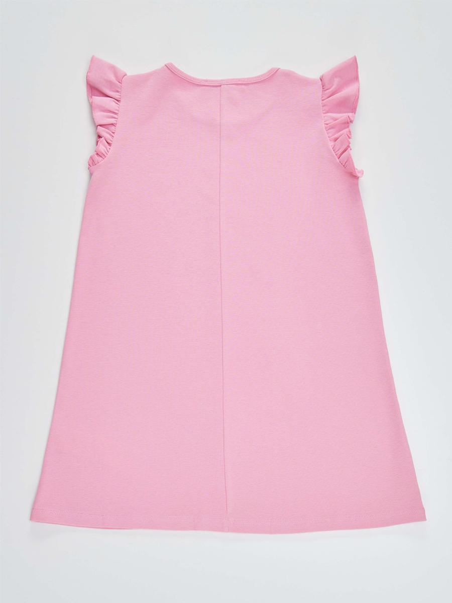 Pamuklu penye kumaştan, omuzları fırfır detaylı kız çocuk elbise. Elbisenin üzerinde gümüş simli kumaştan tavşan aplikesi vardır. Tüm Denokids ürünleri çocuk güvenlik kurallarına uygun üretilmekte ve tek tek iğne dedektörlerinden geçmektedir. %95 Pamuk %5 Elastan