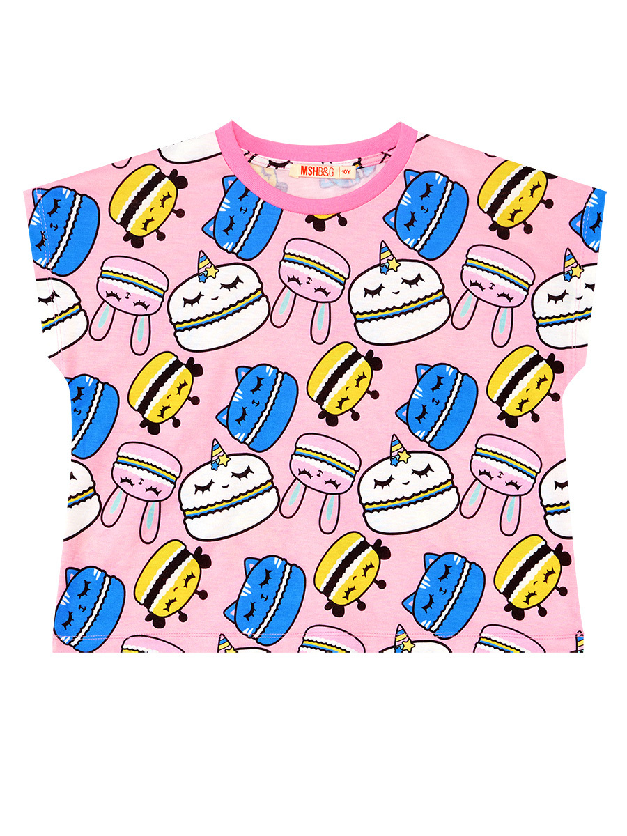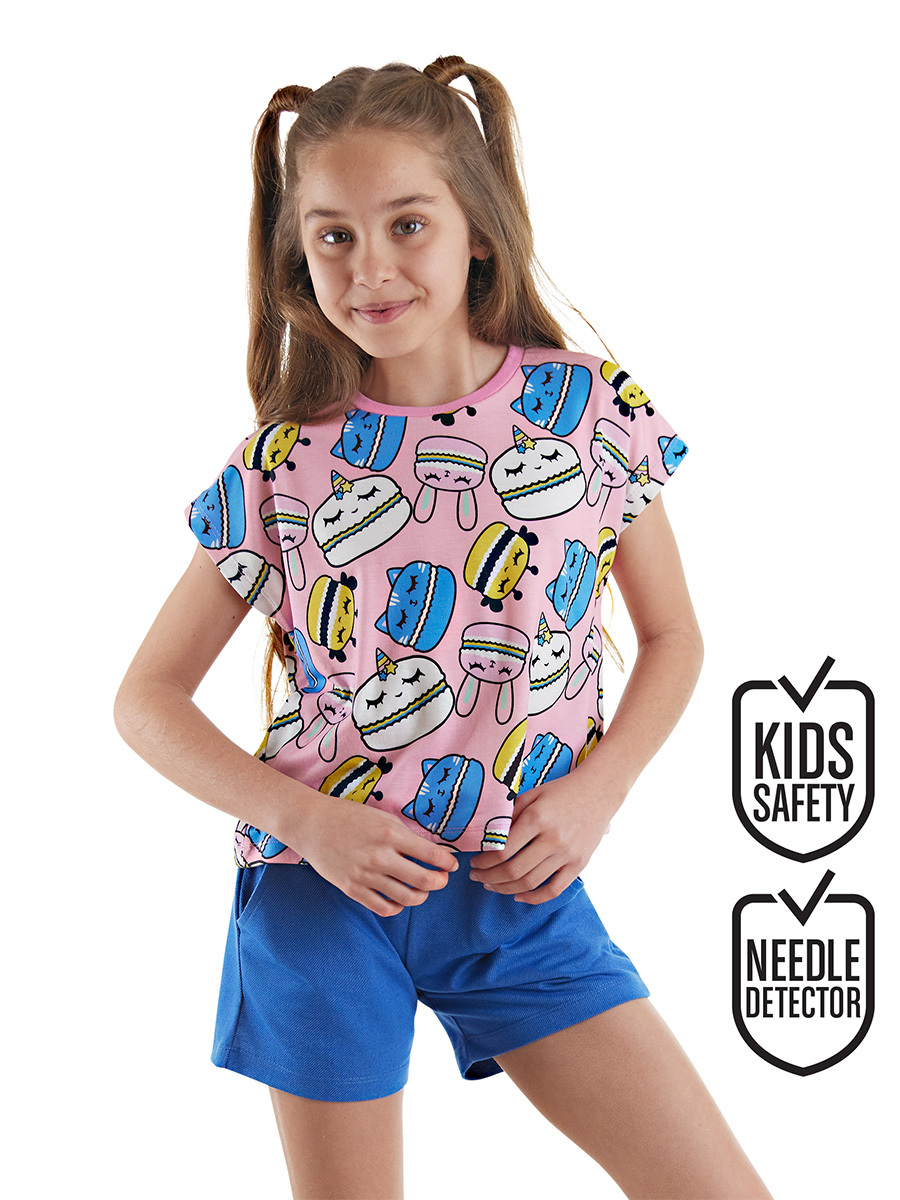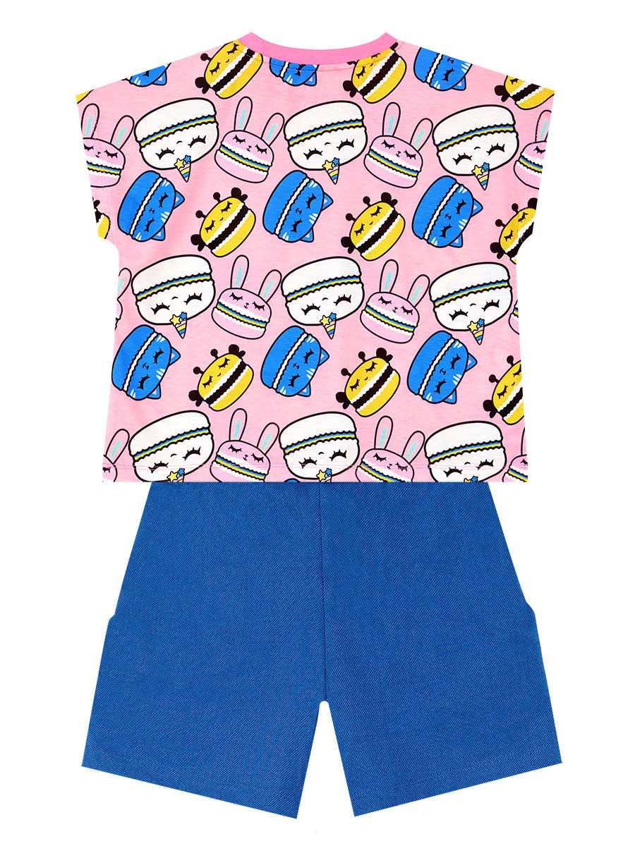 2 parça takım. Tüm yüzeyi kurabiye baskılı, crop-top kesim t-shirt. Şortu denim görünümlü kumaştan üretilmiştir. 2 yan ceplidir. Beli lastik ve kordonludur. Tüm MSHB&G ürünleri çocuk güvenlik kurallarına uygun üretilmekte ve tek tek iğne dedektörlerinden geçmektedir. Üst: %95 Polyester %5 Elastan - Alt: %65 Polyester %35 Pamuk