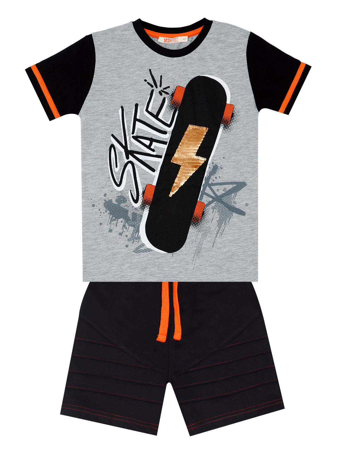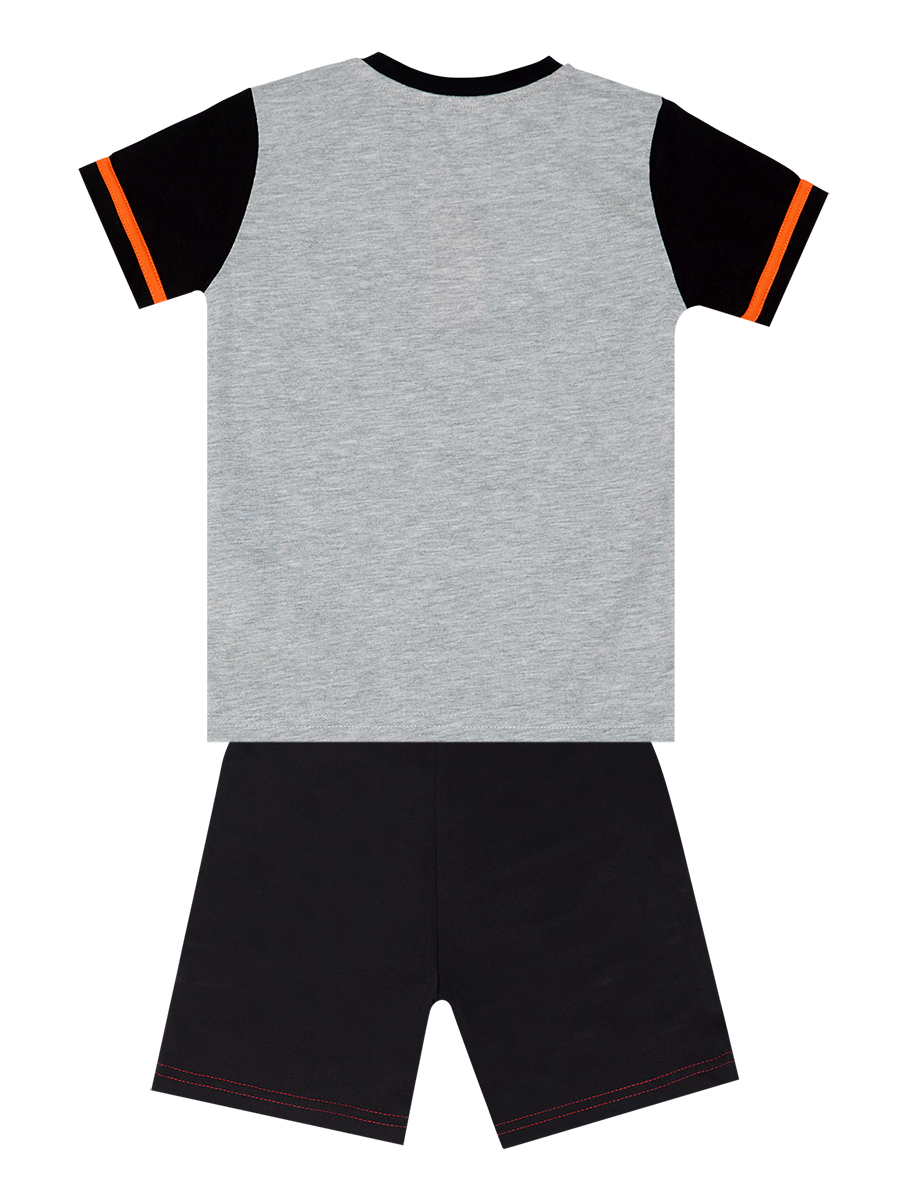 2 parça erkek çocuk şort takım. Kaykay baskılı, yön değiştiren pullar ile şimşek deseni işlenmiş, kolları turuncu bant detaylı t-shirt ve siyah pamuklu kumaş üzerine özel dikiş detaylı şort. Üst: %65 Pamuk %30 Polyester %5 Elastan - Alt: %95 Pamuk %5 Elastan