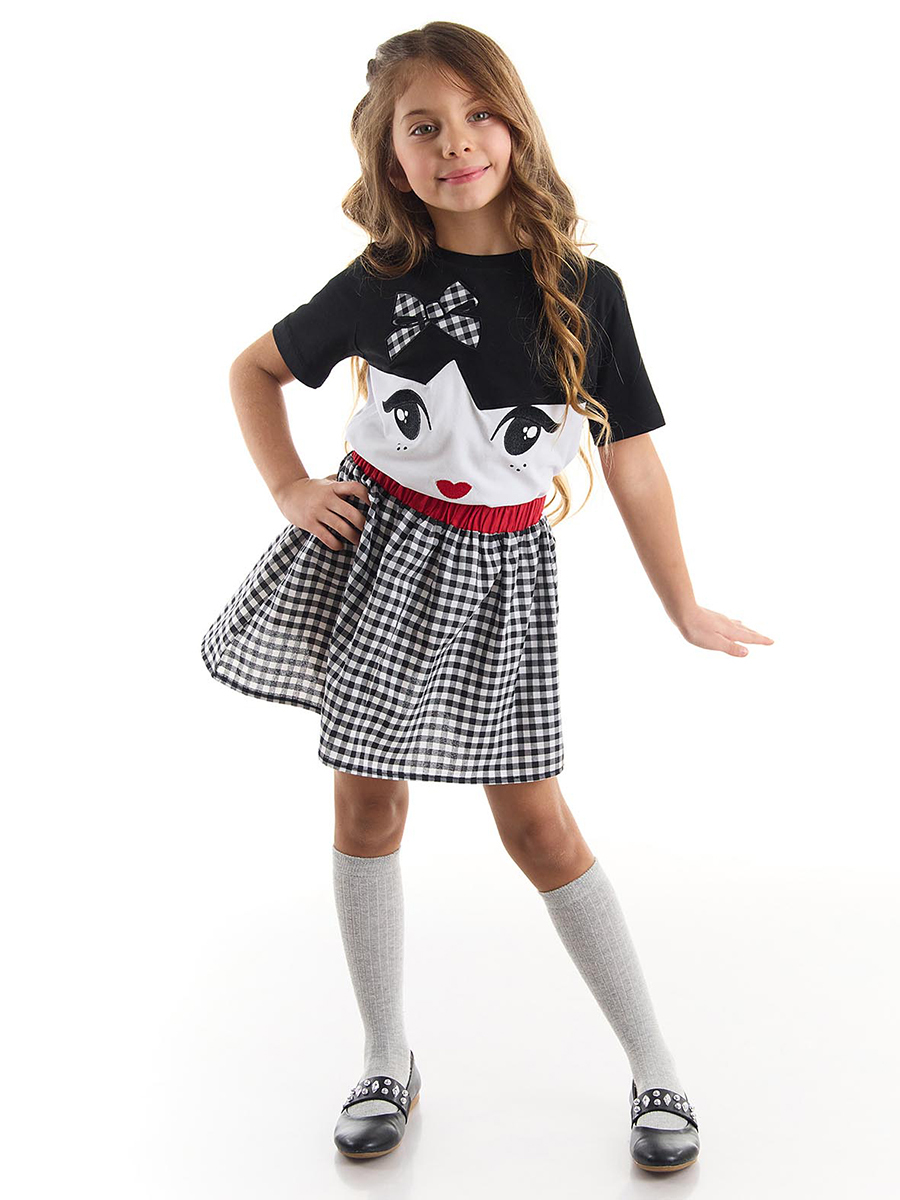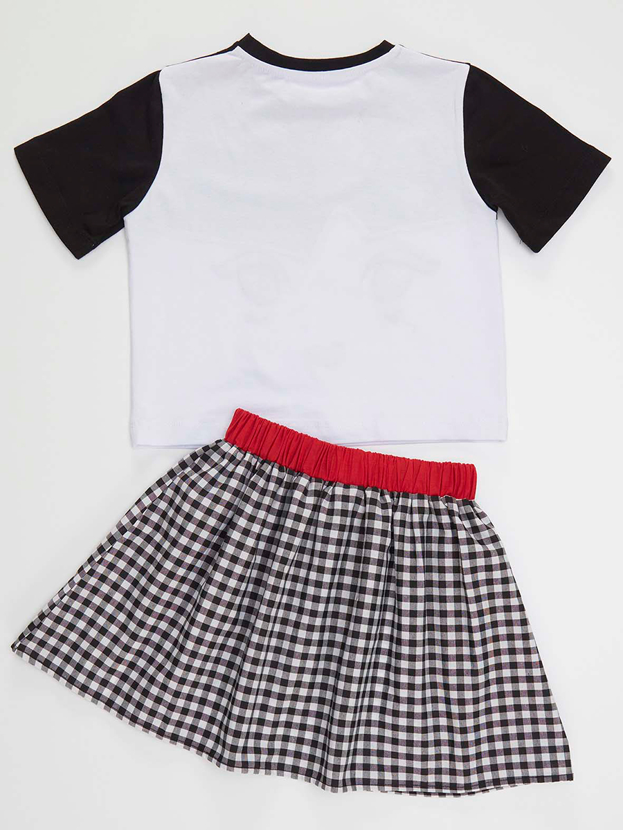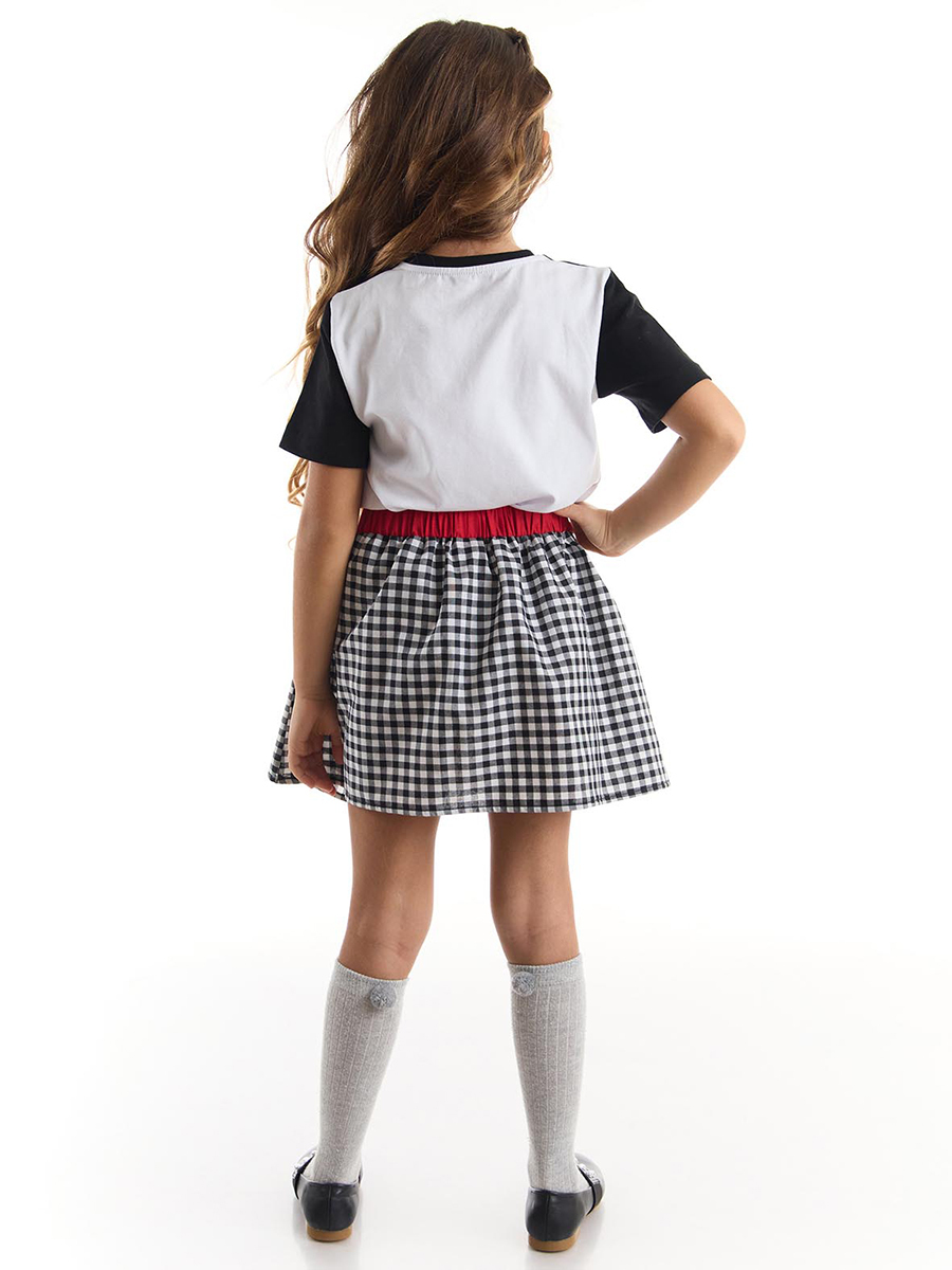 2 Parça Takım. Ekose Etek + Aplikeli, Beli Lastikli T-Shirt. Etek: %100 pamuk, T-Shirt: %92 pamuk, %8 Elastan