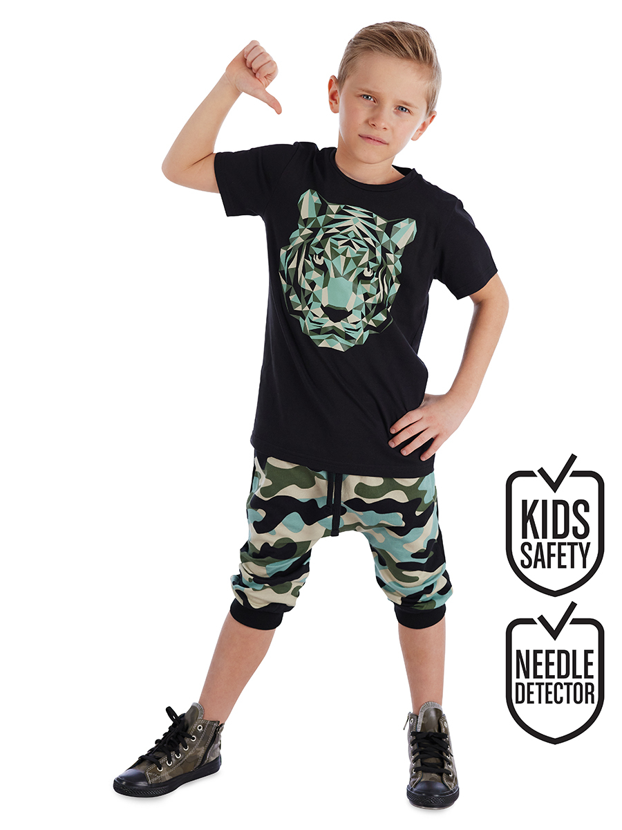 2 piece boy set. Cotton jersey, striped t-shirt with a tiger print on. Cotton, baggy style capri with strings on waist. The front of the capri is made of camo printed fabric, back is plain black.