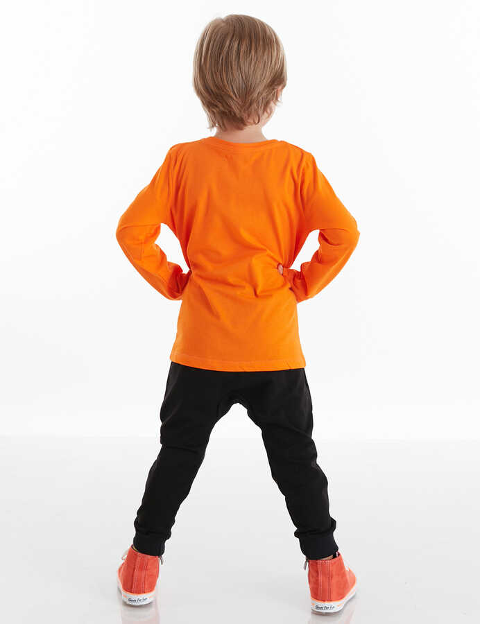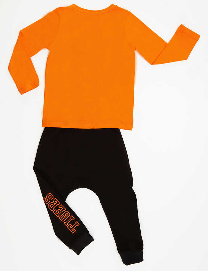 2 piece boy set. Long sleeve, cotton jersey t-shirt with a tiger print on. And its matching harem style, cotton sweat-pants with a slogan print on single leg. top %92 cotton %8 elastane bottom;%65 cotton %35 polyester