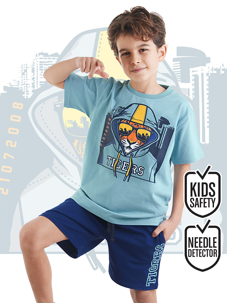 2 parça erkek çocuk t-shirt ve şort takım. Pamuklu kumaştan, bir paçası yazı baskılı erkek çocuk şort. Şortun beli lastikli ve kordonludur. Takımın tamamlayıcısı pamuklu penye kumaştan üzeri kaplan baskılı t-shirt. Tüm Denokids ürünleri çocuk güvenlik kurallarına uygun üretilmekte ve tek tek iğne dedektörlerinden geçmektedir. Üst: %95 Pamuk %5 Elastan - Alt: %92 Pamuk %8 Elastan