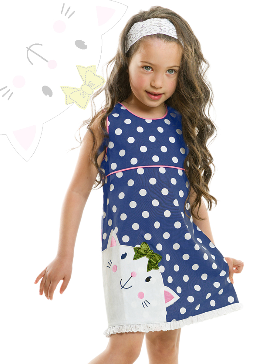 Kedili Puantiyeli Kız Çocuk Lacivert Yazlık Poplin Elbise