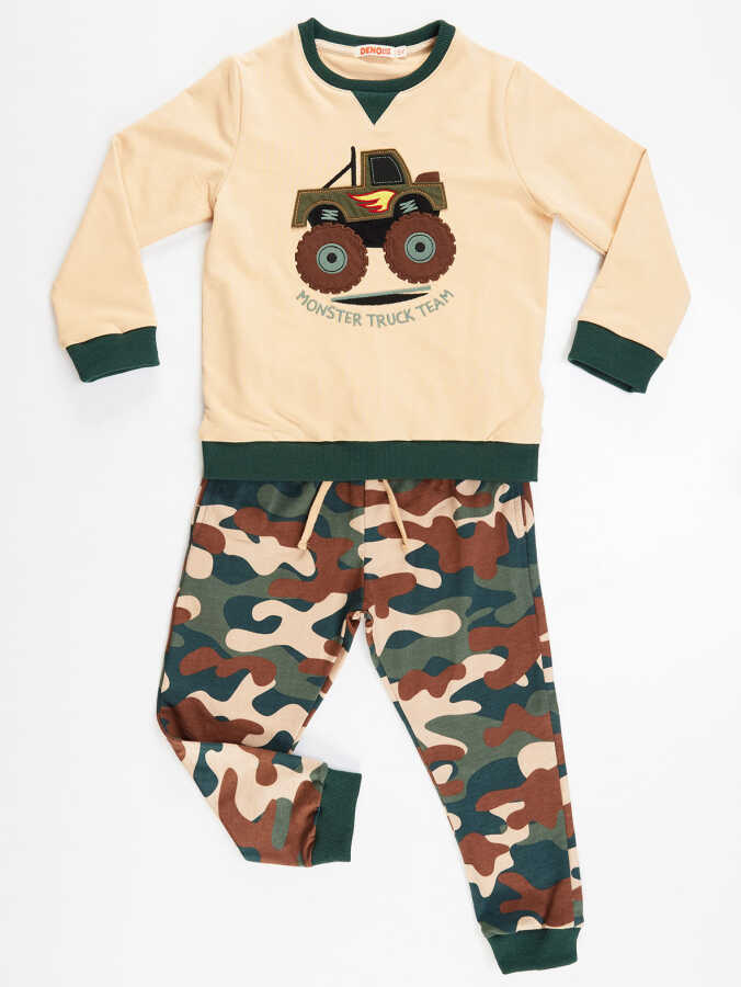 2 parça erkek çocuk eşofman takım. Pamuklu orta kalın kumaştan, üzeri aplikeli sweatshirt ve orta kalın, pamuklu kumaştan kamuflaj desenli, beli lastik ve kordn detaylı eşofman altı. Üst: %92 Pamuk %8 Elastan Alt: %100 Pamuk
