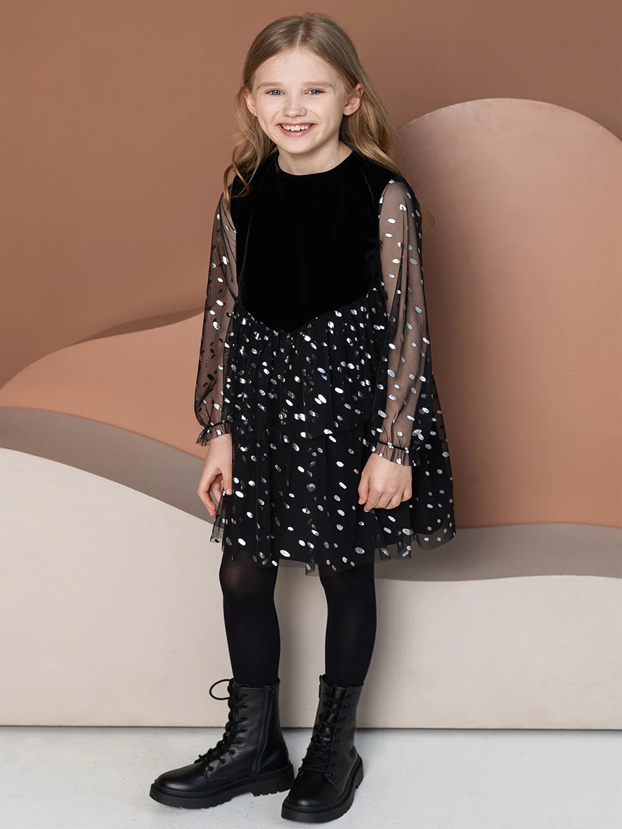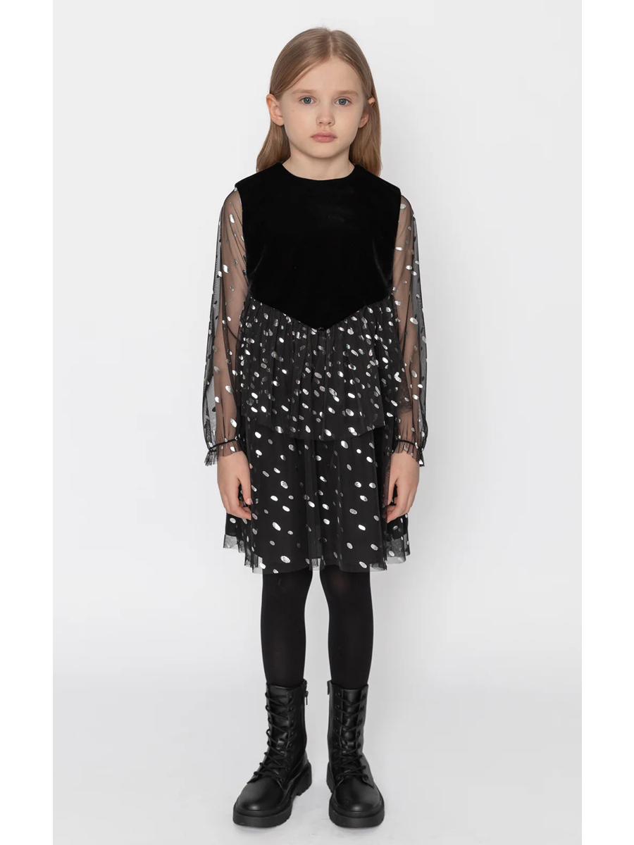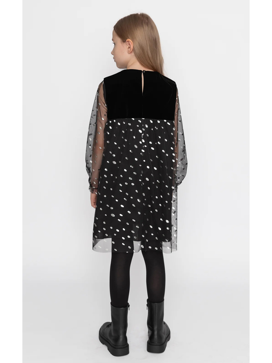 Tül Kollu Işıltılı Kadife Elbise