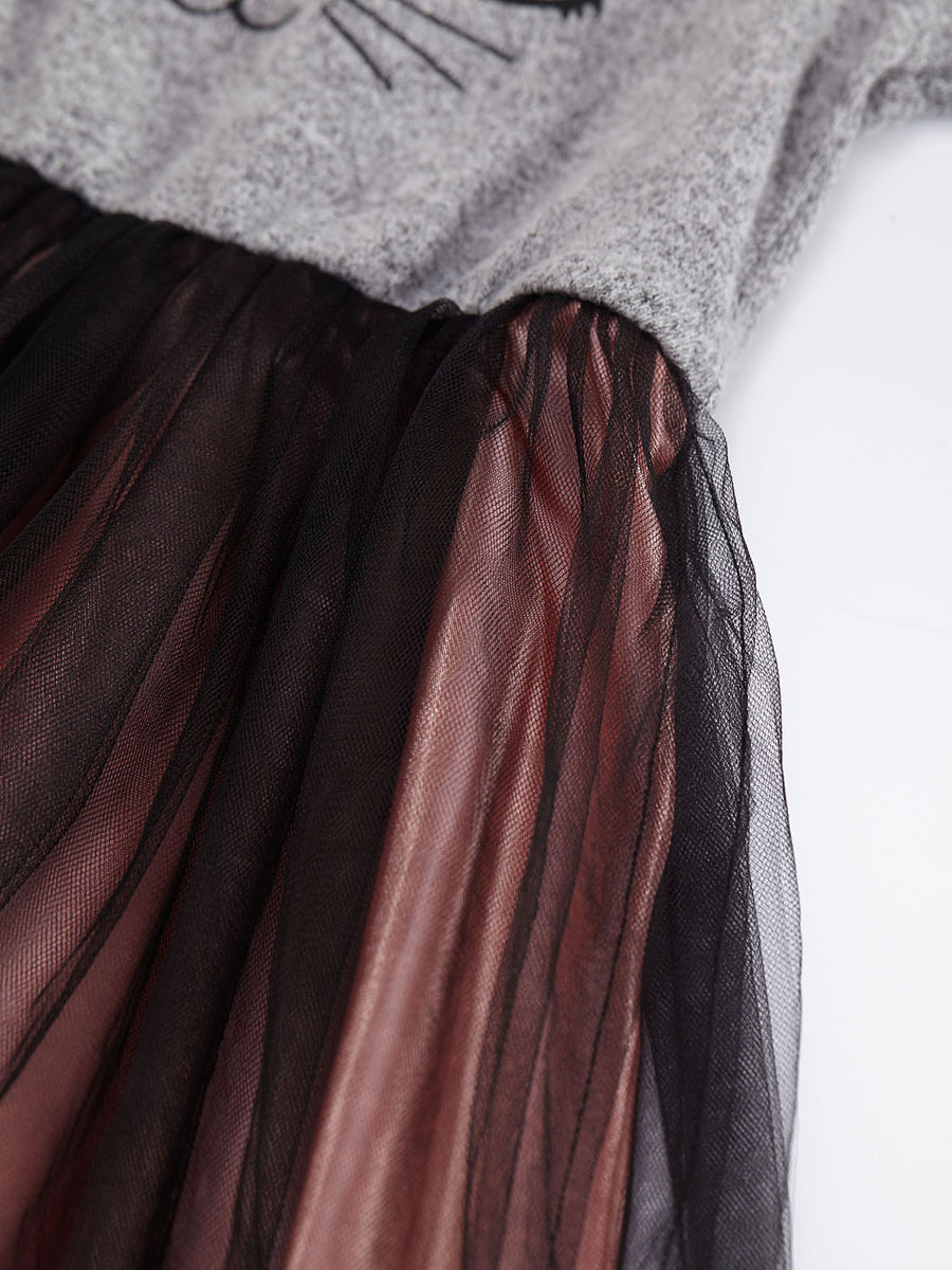 Üst gövdesi triko tarz örülmüş gri kumaştan, kedi aplikeli elbise. Etekler 2 kat dikilmiştir. Alt kata saten ile parlak bir hava verilirken, üst katta tül kullanılarak tasarıma hareket kazandırılmıştır. K1: %98 Polyester %2 Elastan, K2,K3: %100 Polyester
