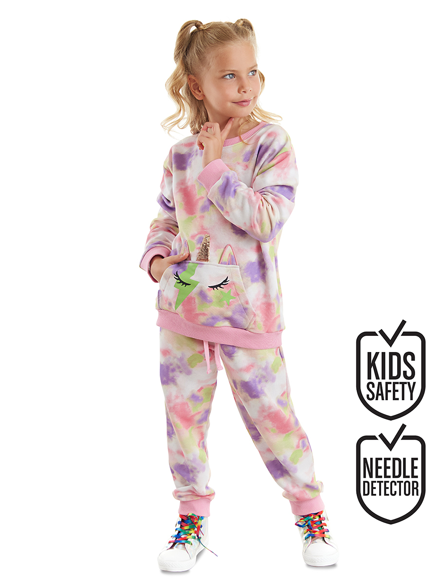2 parça kız çocuk eşofman takım. Kalın kışlık kumaştan, batik desenlidir. Eşofman üstünde unicorn şeklinde kanguru cep vardır. Unicorn boynuz ve kulakları 3 boyutludur. Eşofman altının beli ve paçaları lastiklidir. Tüm MSHB-G ürünleri çocuk güvenliği düşünülerek üretilmiştir ve iğne dedektörlerinden geçirilmiştir. Üst,Alt: %59 Pamuk %41 Polyester