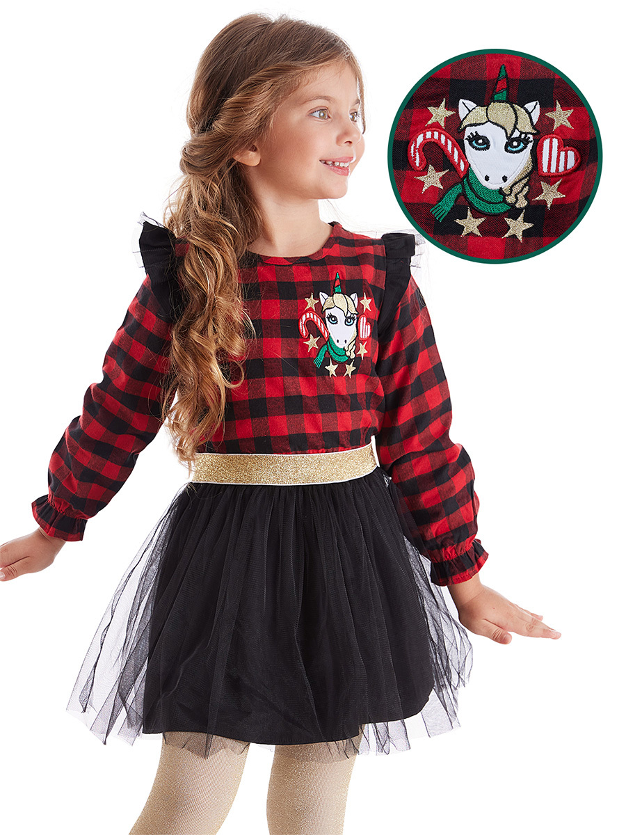 Dress with plaid fabric on top and tulle skirts. There is a lining underneath the tulle. A unicorn applique on chest and gold shine elastic bant on waist. All MSHB&G products are produced within Kids Safety Guidelines. To avoid any needles