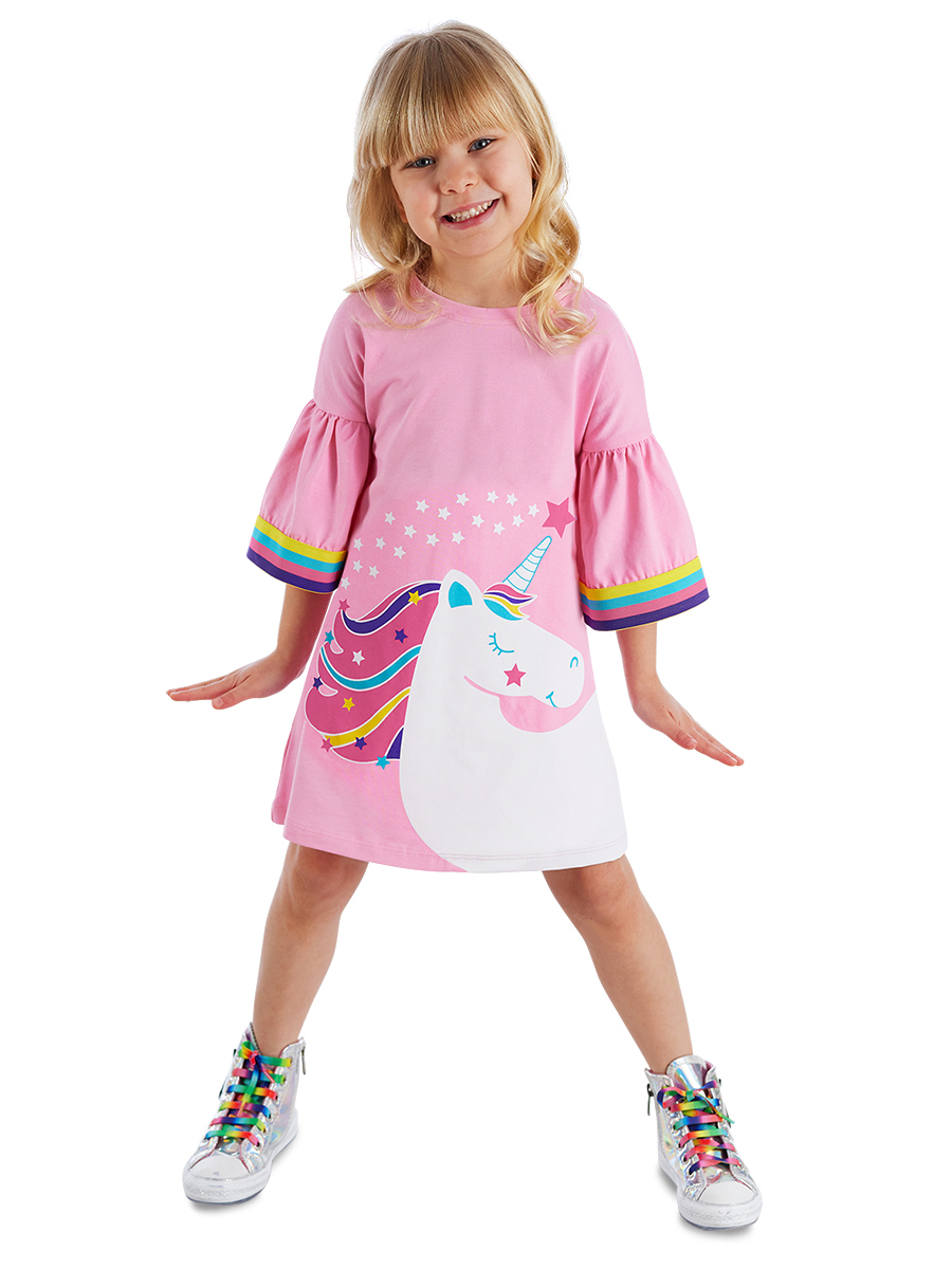Blue, cotton jersey dress with a unicorn print on. There is a colorful striped bant on the arms of the dress. 95% Cotton 5% Elastane