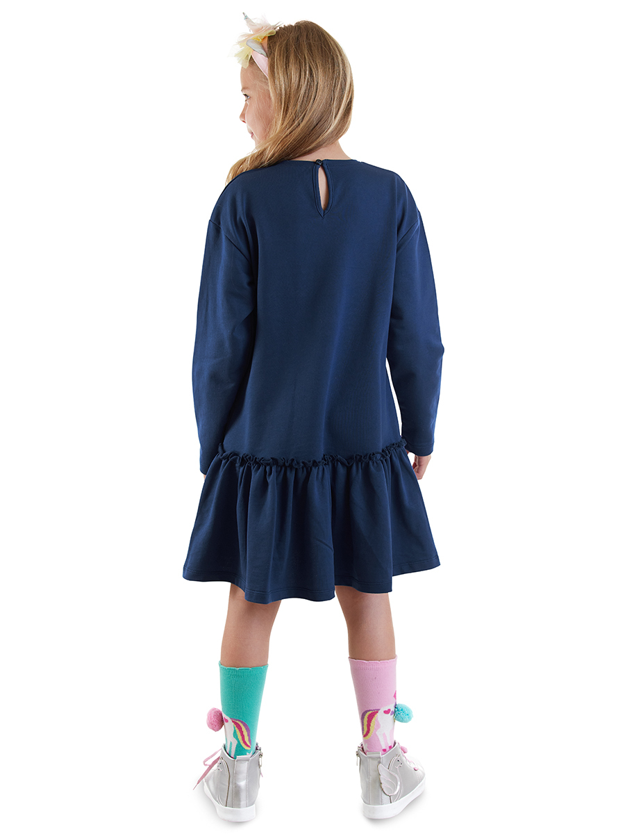 Medium thick 100% French Terry cotton fabric girl navy blue dress. Long sleeves, crew neck, knee length. Botton fastening at back. Unicorn printed. Skirts are ruffled, top layer of the ruffles are made of colorful tulle. All Denokids produc