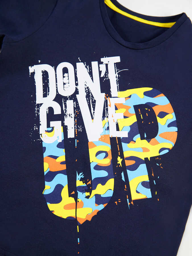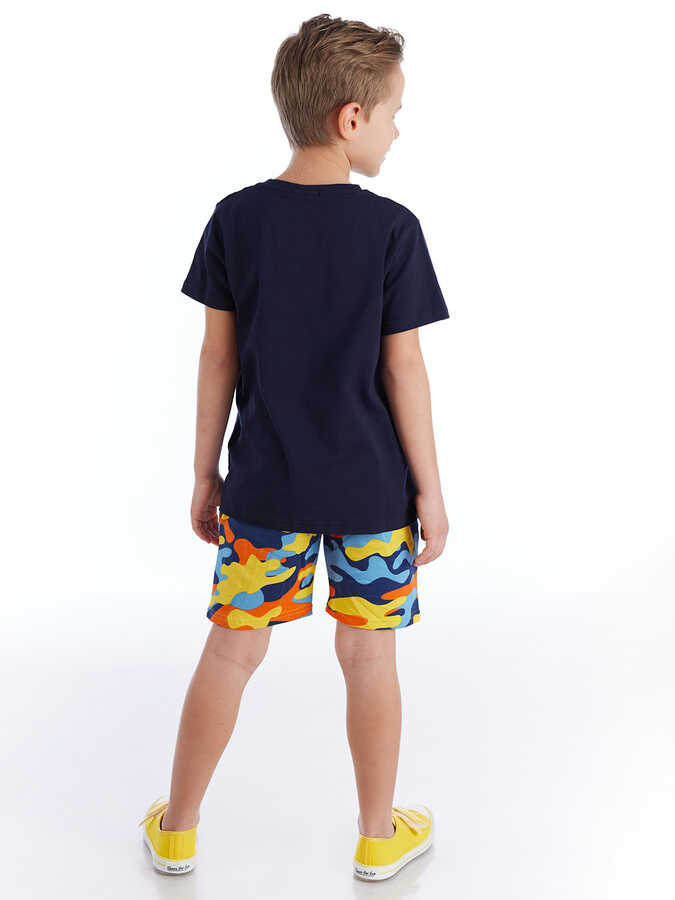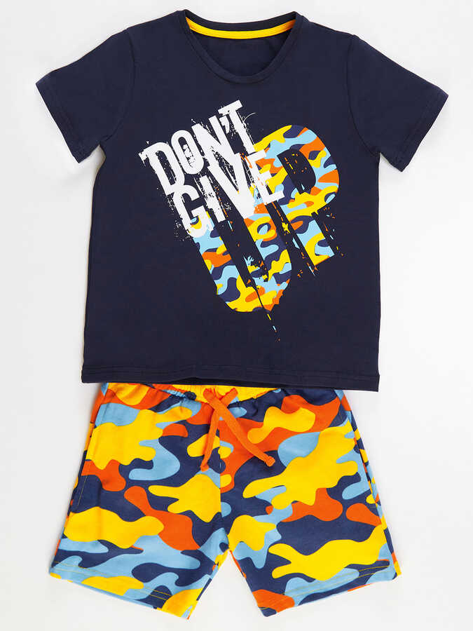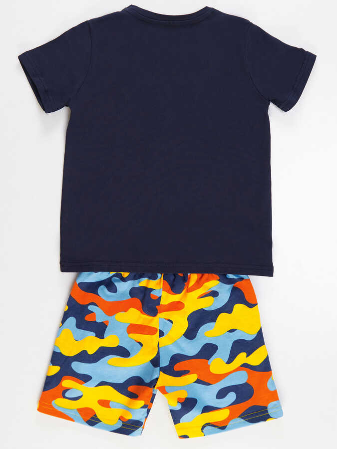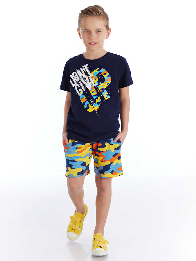 2 parça erkek çocuk takım. Üzeri baskılı, pamuklu penye kumaştan t-shirt ve kamuflaj desenli, pamuklu kumaştan, yan cepli, beli lastik ve kordonlu şort. Üst: %92 pamuk %8 elastan, Alt: %100 pamuk