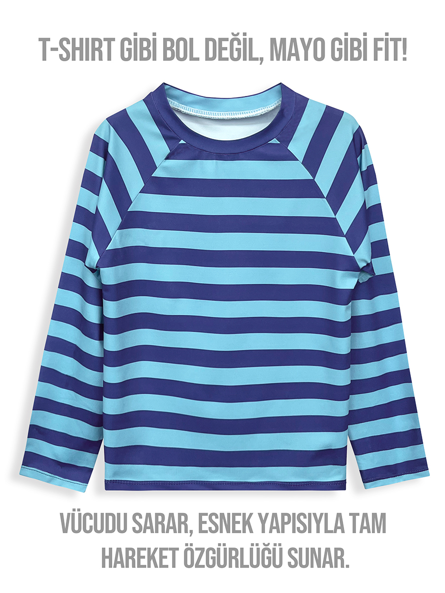 Güneşin zararlı ışınlarına karşı UVP+50 korumalı mayo t-shirt. Tüm şortlar ile rahat kombinlenebilsin diye karışık çizgili, marin renklerle tasarlanmıştır. Hareket rahatlığı için ultra esnek özel mayo kumaşından dar kesim olarak tasarlanmıştır. Tüm Denokids ürünleri Avrupa standartlarında çocuk güvenlik kurallarına göre üretilmektedir. İğne krıklarını tespit edebilmek için tek tek metal dedektörlerden geçilirmektedir. %85 Polyester %15 Elastan