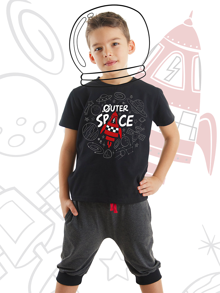 2 parça erkek takım. Pamuklu penye kumaştan, siyah t-shirt. Üzeri roket baskılı. Düşük ağ kesimli, pamuklu kumaştan, kapri boy pantolon. İki yan ceplidir. Beli lastik ve kordonludur. Tüm MSHB&G ürünleri çocuk güvenlik kurallarına uygun olarak üretilmekte ve iğne dedektörlerinden geçmektedir. Üst: %48 Pamuk %48 Polyester %4 Viskon - Alt: %100 Pamuk