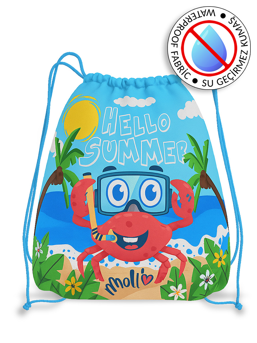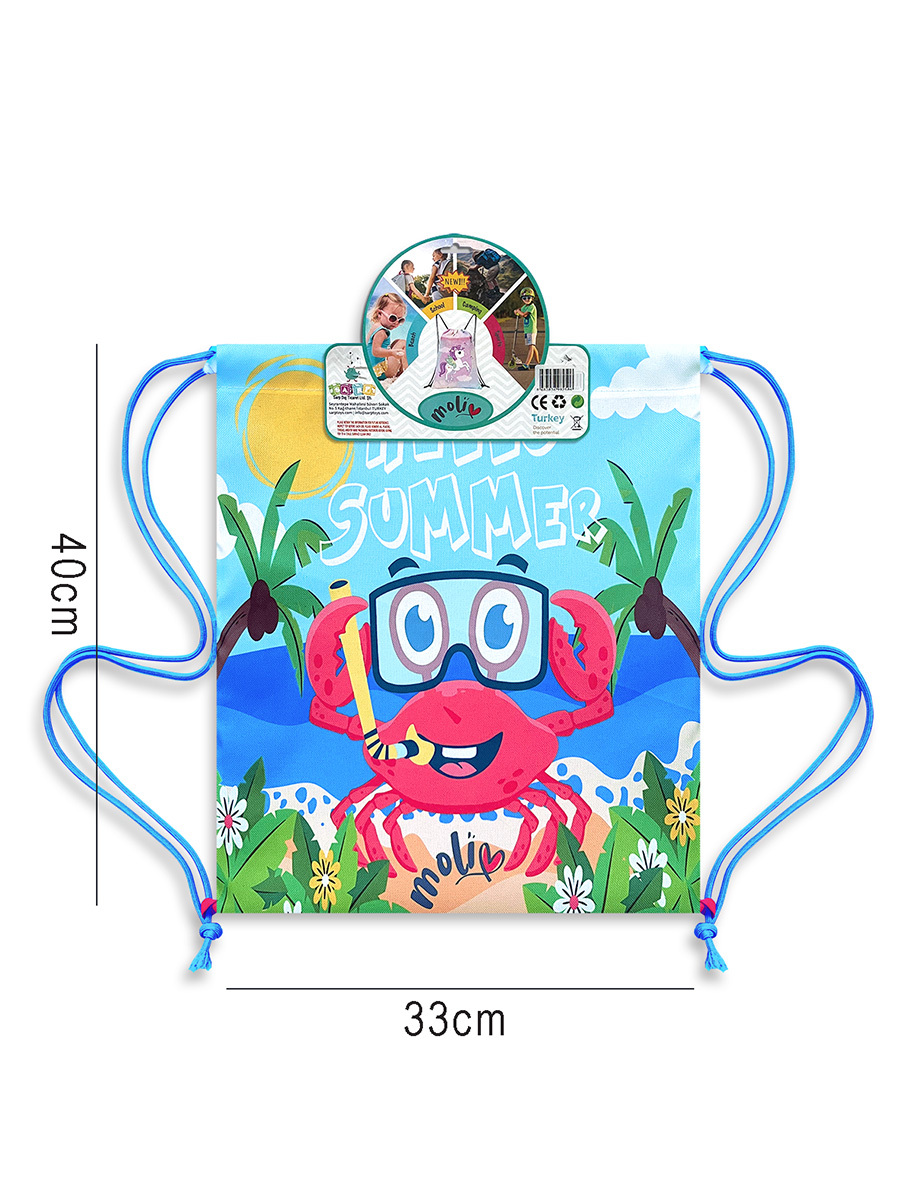 Canlı yengeç deseniyle dikkat çeken bu su geçirmez ipli sırt çantası, erkek çocuklar için plaj ve havuzda ideal bir yardımcıdır. 33x40 cm ölçüleri sayesinde havlu, mayo ve oyuncaklar rahatça sığar. Hafif yapısı ve suya dayanıklı kumaşıyla yaz tatillerinin vazgeçilmez çantası! %100 Polyester
