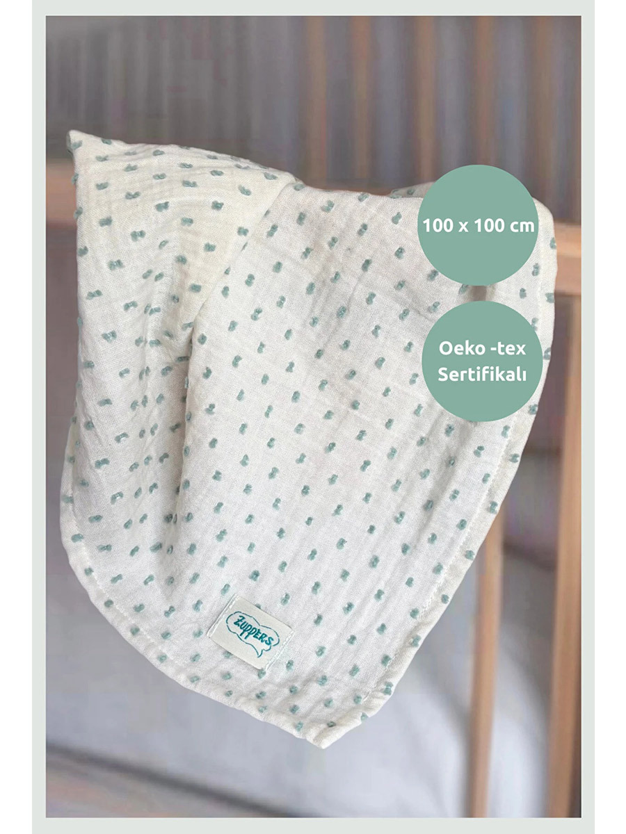 2 kat dokuma ile üretilmiş olup, 100*100 cm büyük boy ölçüsü sayesinde kundak yapmak için de uygun boyuttadır.; Ekru üzeri yeşil ponpon nakışlıdır.; Bebekler için doğal içeriklerden oluşan Oeko-tex sertifikalıdır.; Müslin örtü dayanıklıdır, nefes alır, yumuşak dokusuyla bebeğinizin nazik cildine uyumludur.; Dokuma etiketi bile %100 pamuktan üretilmiştir.; Müslin battaniye yıkandıktan sonra daha da yumuşar, kendiliğinden bürümcüklenen bir dokuya sahiptir.; İstenirse ütülenerek tekrar düzleştirilebilir.100x100 cm Müslin örtü kullanım alanları:Yatakta veya pusette uyurken örtü battaniyePuset güneşlikBebek yatak çarşafı Yenidoğan zarf kundakAlt açma örtüsüOmuz örtüsüBebeğin altına sermek için misafirlikte örtüKurulama ÖrtüsüOyun halısıÇamaşır makinesinde ve elde max 40°C derecede yıkanabilir.; Düşük ısıda ütülenebilir.; Tamburlu Kurutma pamuklu ürünlerde önerilmemektedir.; %100 PamukTürkiye’de tasarlanmış ve üretilmiştir. %100 Pamuk