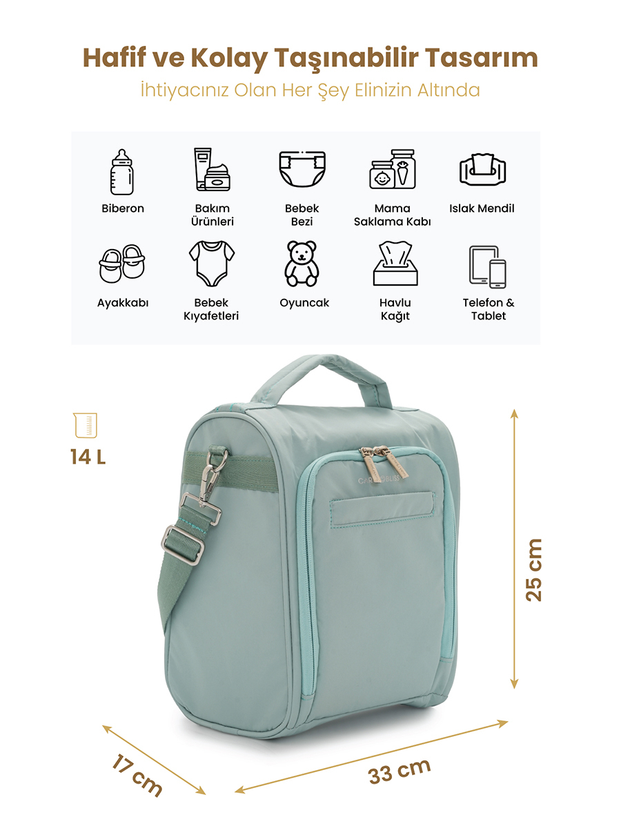 Detaylar • Boyutlar – 33 cm G × 25 cm Y × 17 cm D • Ana Bölme – Fermuarlı ana bölme ile eşyalarınız düzenli ve güvenli bir şekilde saklanır • Ön Cep – Fermuarlı ön cep, hızlı erişim için ideal • Taşıma – Elde taşıma sapı sayesinde kolay kullanım • Askılar – Ayarlanabilir ve çıkarılabilir çapraz askı, omuz veya çapraz kullanım olanağı sunar • Bebek Arabasına Takılan Askı – Bebek arabasına kolayca takılabilen tasarımıyla pratik kullanım olanağı sağlar • Kumaş – Antibakteriyel astar, hijyenik ve sağlıklı kullanım sağlar • Ekstralar – Hafif ve kompakt tasarımıyla günlük kullanım ve seyahat için uygundur Özellikler • Antibakteriyel astar, bebek bakım ürünlerinin hijyenini korur • Fermuarlı ana bölme ve ön cep ile eşyalar düzenli ve güvenli • Ayarlanabilir ve çıkarılabilir çapraz askı sayesinde farklı taşıma seçenekleri • Elde taşıma sapı, hızlı ve pratik kullanım imkânı sunar • Hafif yapısı sayesinde uzun süreli taşımalarda konfor sağlar • ASTM antibakteriyel testi ile onaylanmış, 24 saatte %99 bakteri azalımı sağlar Ürün Hikayesi SnapPack, anneler için tasarlanmış, işlevsellik ve şıklığı bir araya getiren özel bir çantadır. Kompakt ve hafif yapısıyla günlük yaşamda rahat kullanım sunar. Fermuarlı ana bölme ve ön cepler, bebek bakım ürünlerini düzenli şekilde saklamayı sağlar. Antibakteriyel astarı sayesinde hijyenik bir ortam oluşturur, ebeveynlerin içi rahat eder. Ayarlanabilir ve çıkarılabilir çapraz askısı ile çantayı omuzda veya çapraz şekilde taşıyabilir, elde sapını kullanarak hızlı erişim sağlayabilirsiniz. SnapPack, hem fonksiyonel hem de modern tasarımıyla annelerin vazgeçilmez tamamlayıcısıdır. %100 polyester